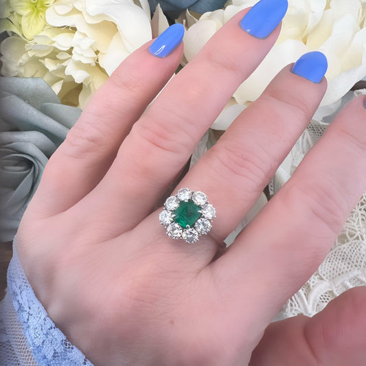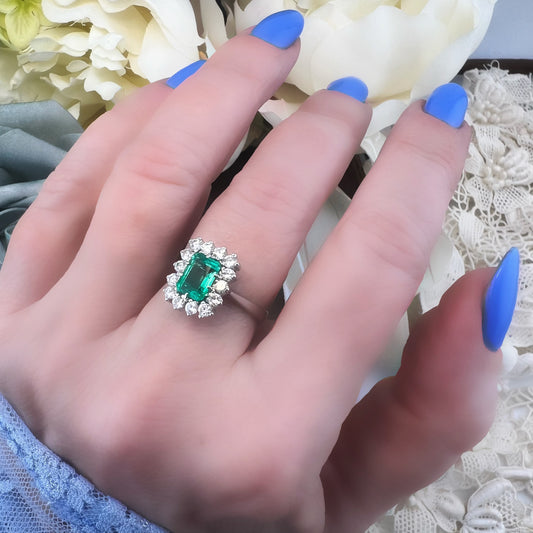 Anello Vintage Margherita – Smeraldo Centrale 0.66 ct e 8 Diamanti in Oro Bianco 18 kt (Anni ’50/’60)