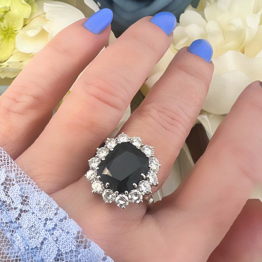 Anello vintage in oro 18K a margherita con zaffiro australiano da 7 ct e diamanti per 1.40 ct