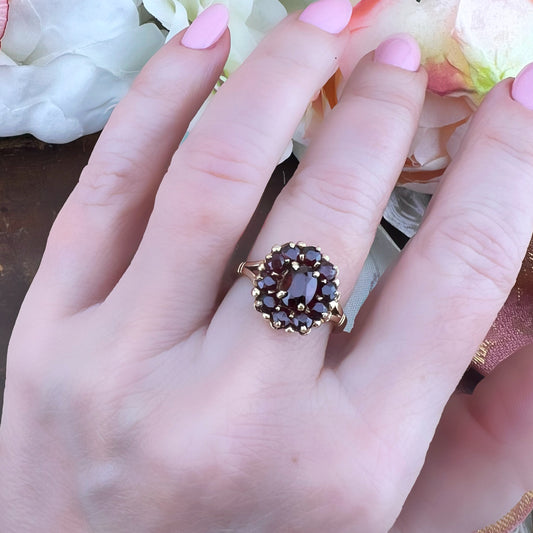 Anello vintage a margherita con granati – Londra, 1986