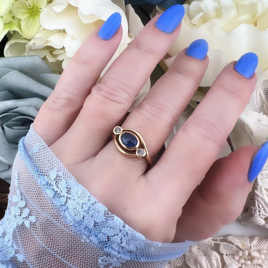 Anello oro 12k zaffiro e diamanti. Italia c. 1920