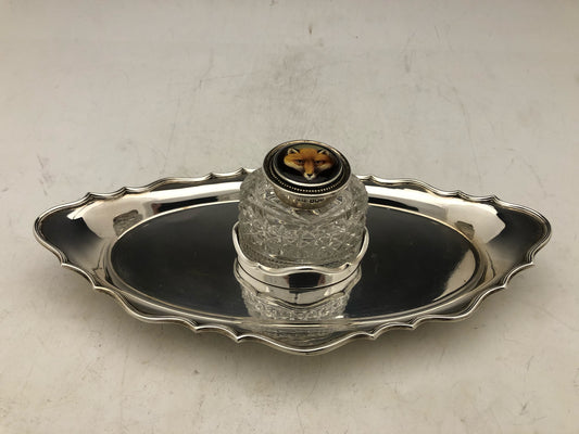 Raro modello di calamaio in argento e smalto dipinto a mano a tema di testa di volpe. Realizzato dalla James Dixon 1927