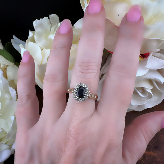 Anello vintage a margherita con zaffiro e diamanti – Londra, 1990