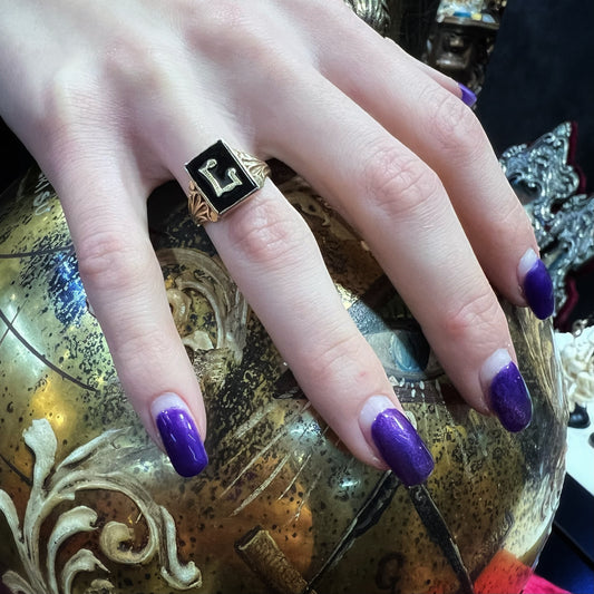 Anello vintage 1966 in oro e onice con iniziale L in oro