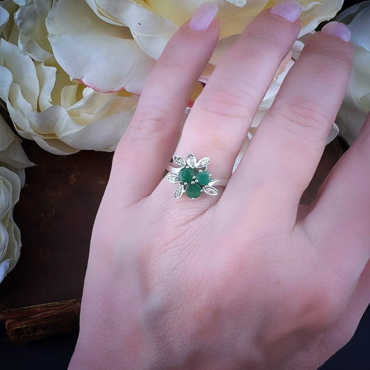 Anello Vintage in Oro Bianco con Smeraldi e Diamanti – Stile Naturalistico (Nord America)