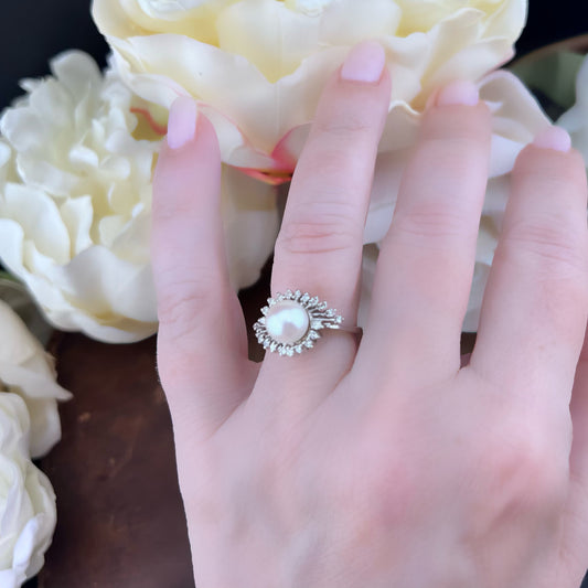 Anello Vintage in Oro Bianco 18 kt con Perla Naturale Coltivata e Diamanti – Anni ’50-’60