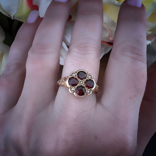 Anello Vintage Inglese in Oro con Granati e Perline – Londra, 1970