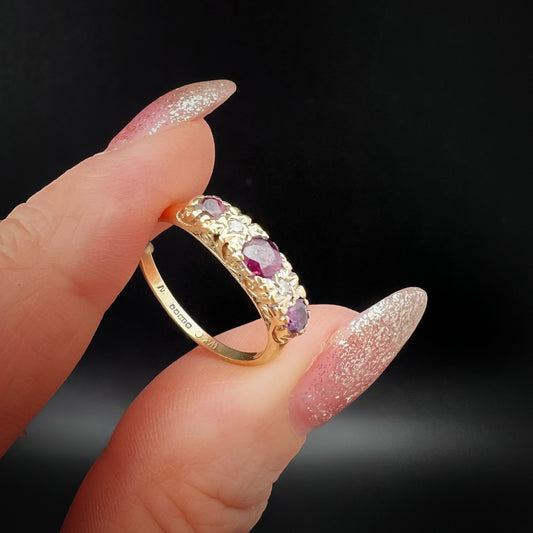 Anello vittoriano in oro 18 carati con rodolite e diamanti a rosetta