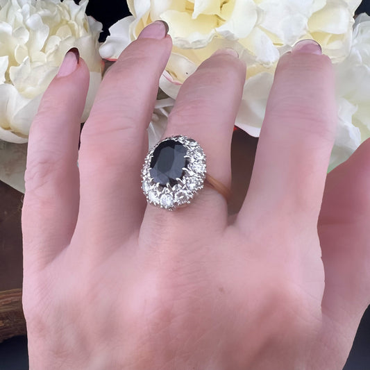 Anello a margherita in oro 18 ct con diamanti old mine e zaffiro naturale da 4.46 ct