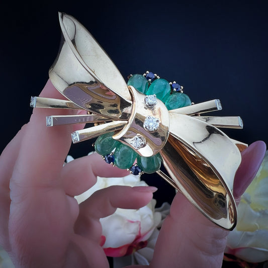Importante spilla in oro, diamanti, smeraldi e zaffiri: Trabert & Hoeffer/Mauboussin REFLECTION