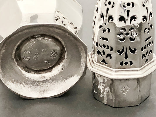Rarissimo spargi zucchero Giorgio I, di forma ottagonale con coperchio ad incastro, traforato a mano. Realizzato in argento a Londra nel 1716