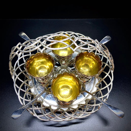 Raro set di cucchiaini da te in argento dorato con pinzetta da zucchero, colino da teiera e dosatore nella scatola originale. Parigi 1838-1880