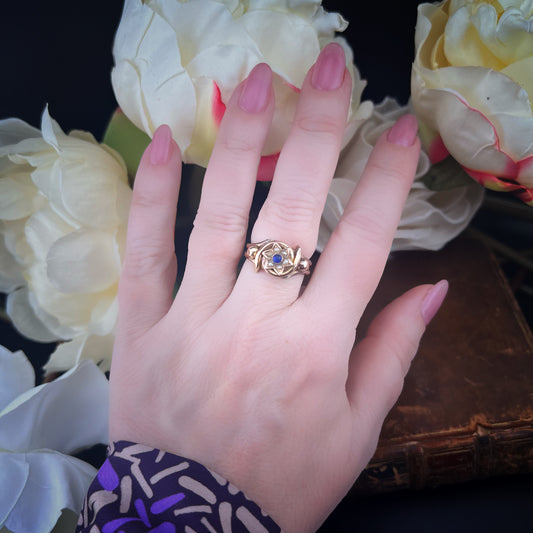 Anello Art Déco in oro 14 ct, diamanti e zaffiro di sintesi