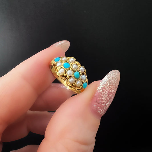 Anello antico Vittoriano del 1878 in oro 15 ct. con perline e turchesi