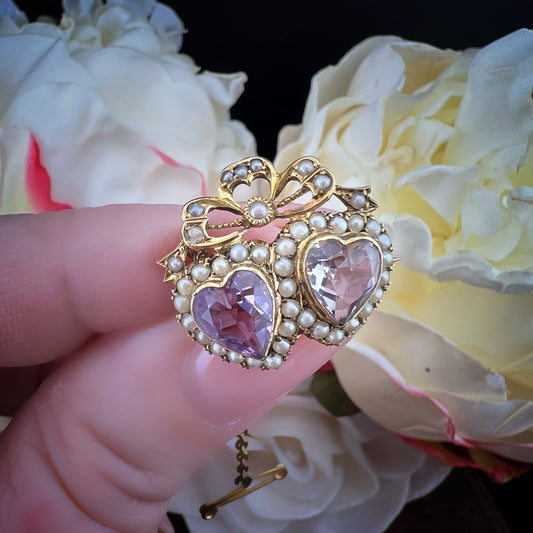 Spilla romantica in oro con due ametiste a cuore e perline di fiume – Epoca Eduardiana 1901-1910