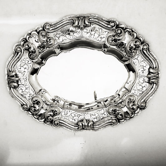 Vassoio inglese in argento cesellato, realizzato da Frederik Elkington a Londra nel 1884