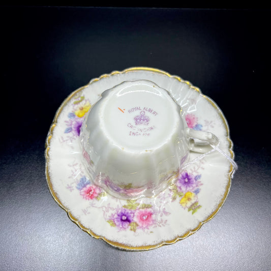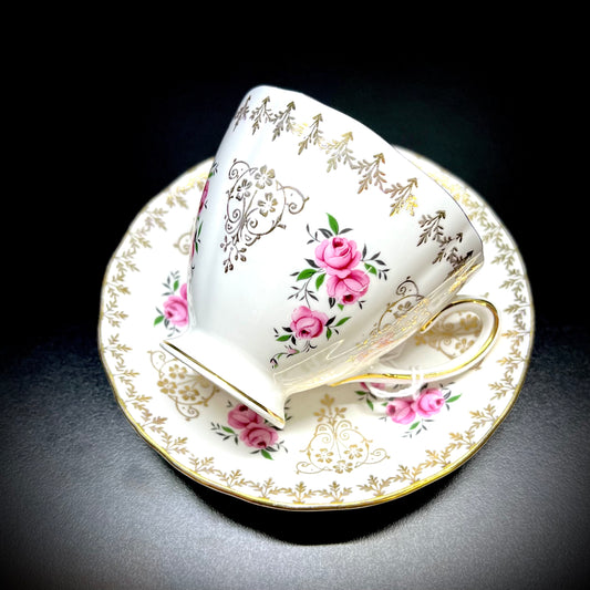 Tazza da tè vittoriana con piattino decorata con ricchi bouquet di fiori bianchi e smalti in rilievo