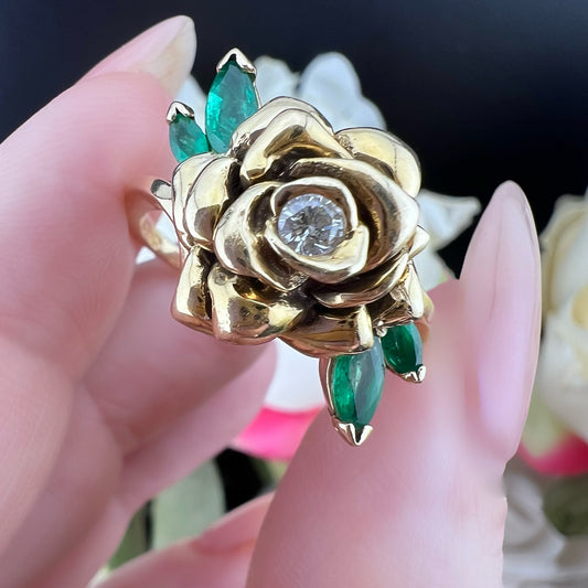 🌹 Anello vintage “Rosa” con diamante e smeraldi colombiani – Franklin Mint, USA – Oro 14 ct