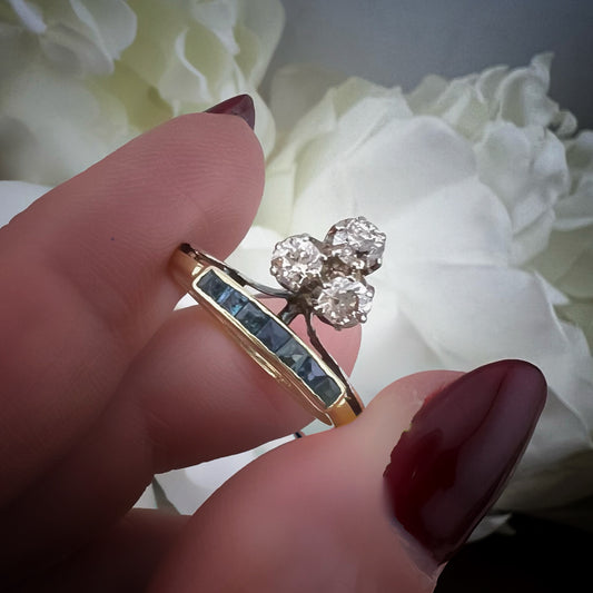 Anello “Memoria di Due Epoche” – Oro bianco e giallo 9 ct, Diamanti Old Mine e Zaffiri naturali