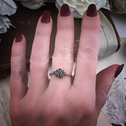 Anello vintage margherita in oro 9 ct con zaffiri e opale – Londra 1979
