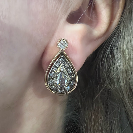 Orecchini a goccia in oro e diamanti Europa, epoca vittoriana (XIX secolo) Oro 18 kt e diamanti antichi originali Diamanti a taglio rosa coroné e old mine cut