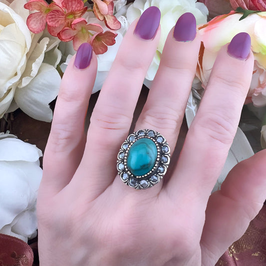 Anello grande margherita con turchese cabochon in oro 18k e diamanti a rosetta