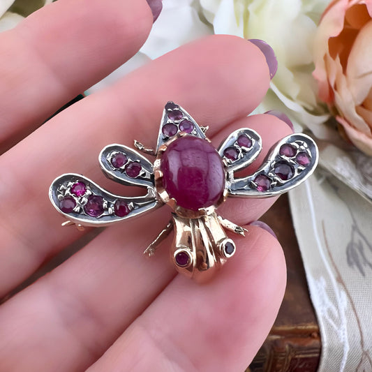 Spilla ape in oro 14k, argento e rubini. C. 1950