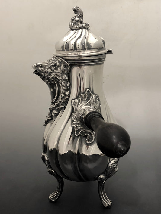 Eine silberne Kaffeekanne mit Vogelkopfausguss und gedrechseltem Ebenholzgriff. Mailand, 1890-1900.