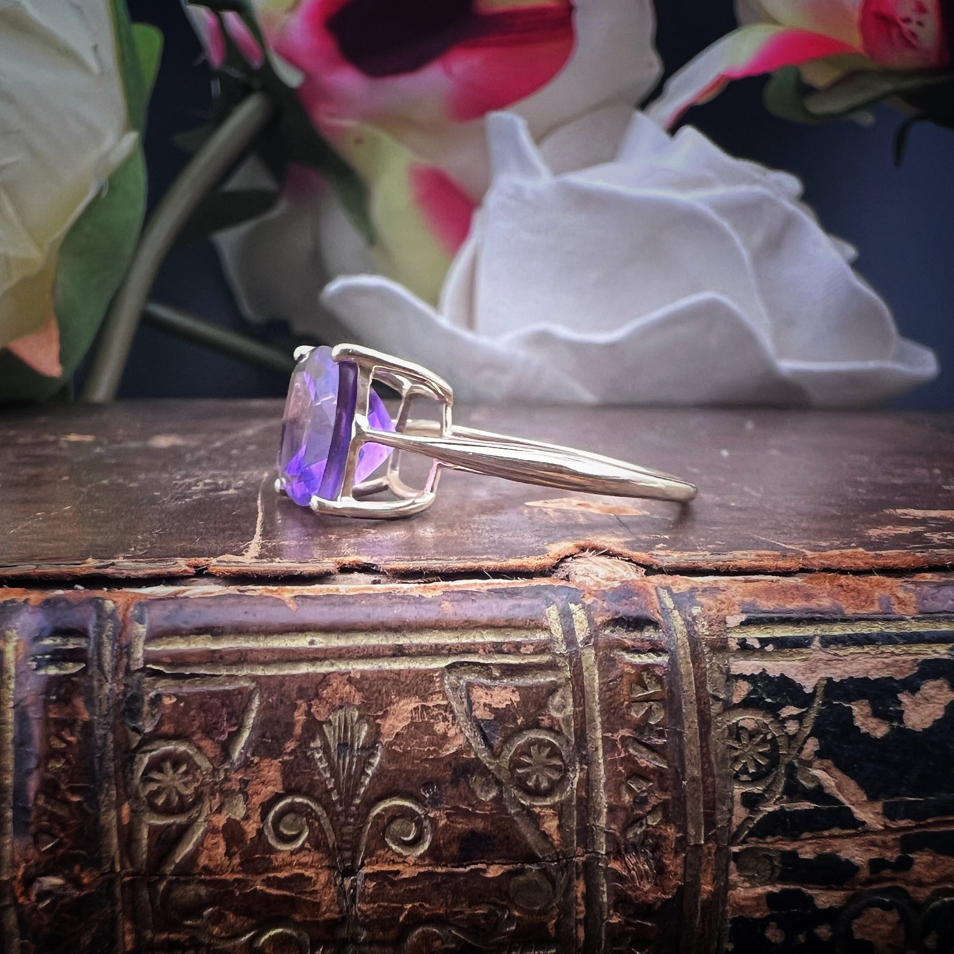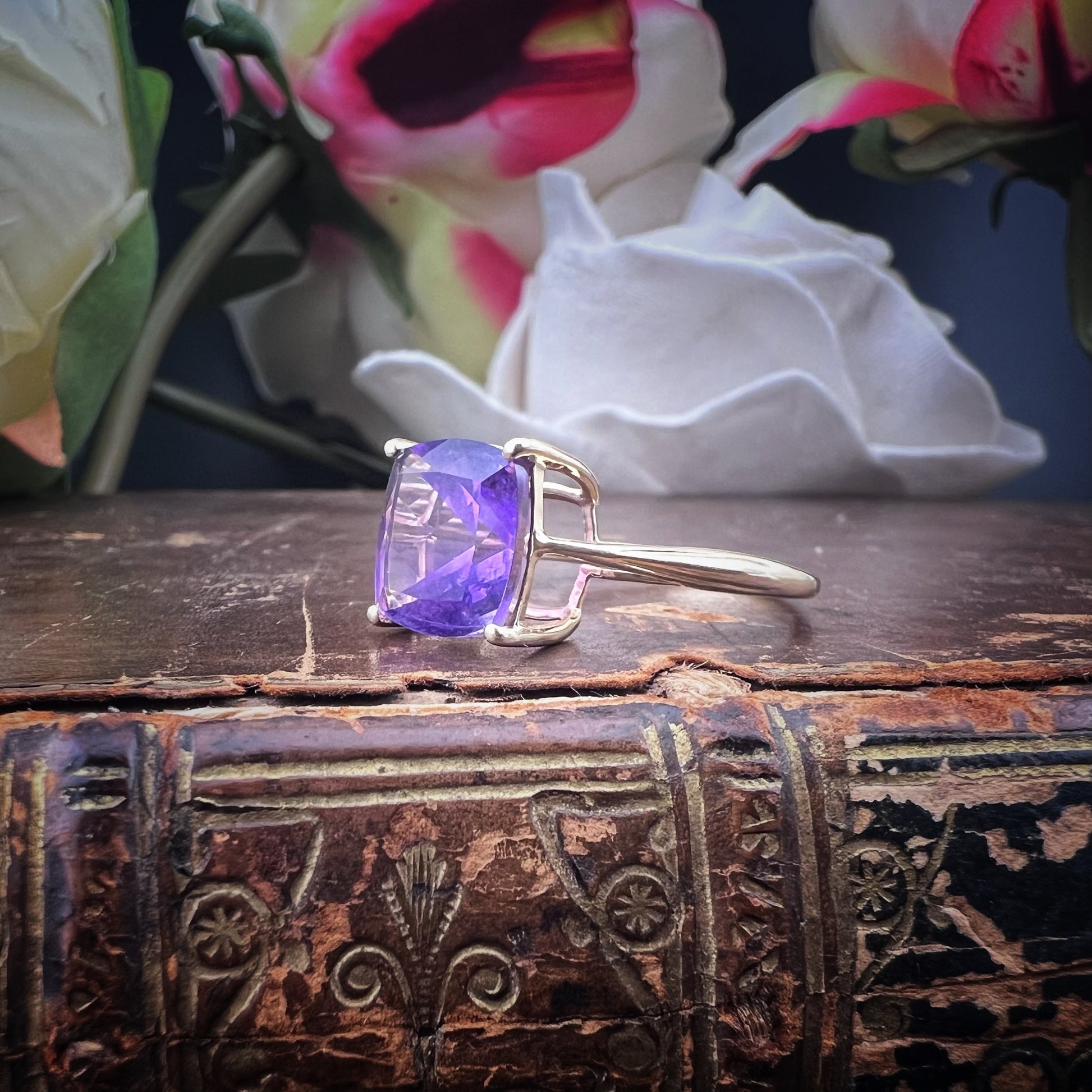 Ein Ring von zeitloser Schönheit mit einem edlen quadratischen Amethyst, besetzt mit vier direkt aus dem Ringschaft geschnitzten Zinken, die den Stein in seiner gesamten Höhe umrahmen. Dieses strukturelle Detail verleiht dem Edelstein nicht nur eine dramatische Präsenz, sondern zeugt auch von der Goldschmiedekunst Birminghams, die für ihre historische Exzellenz bekannt ist.