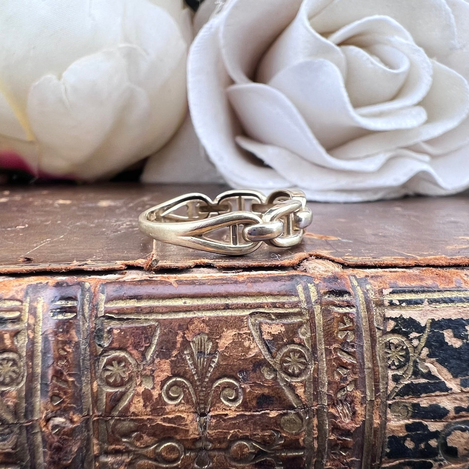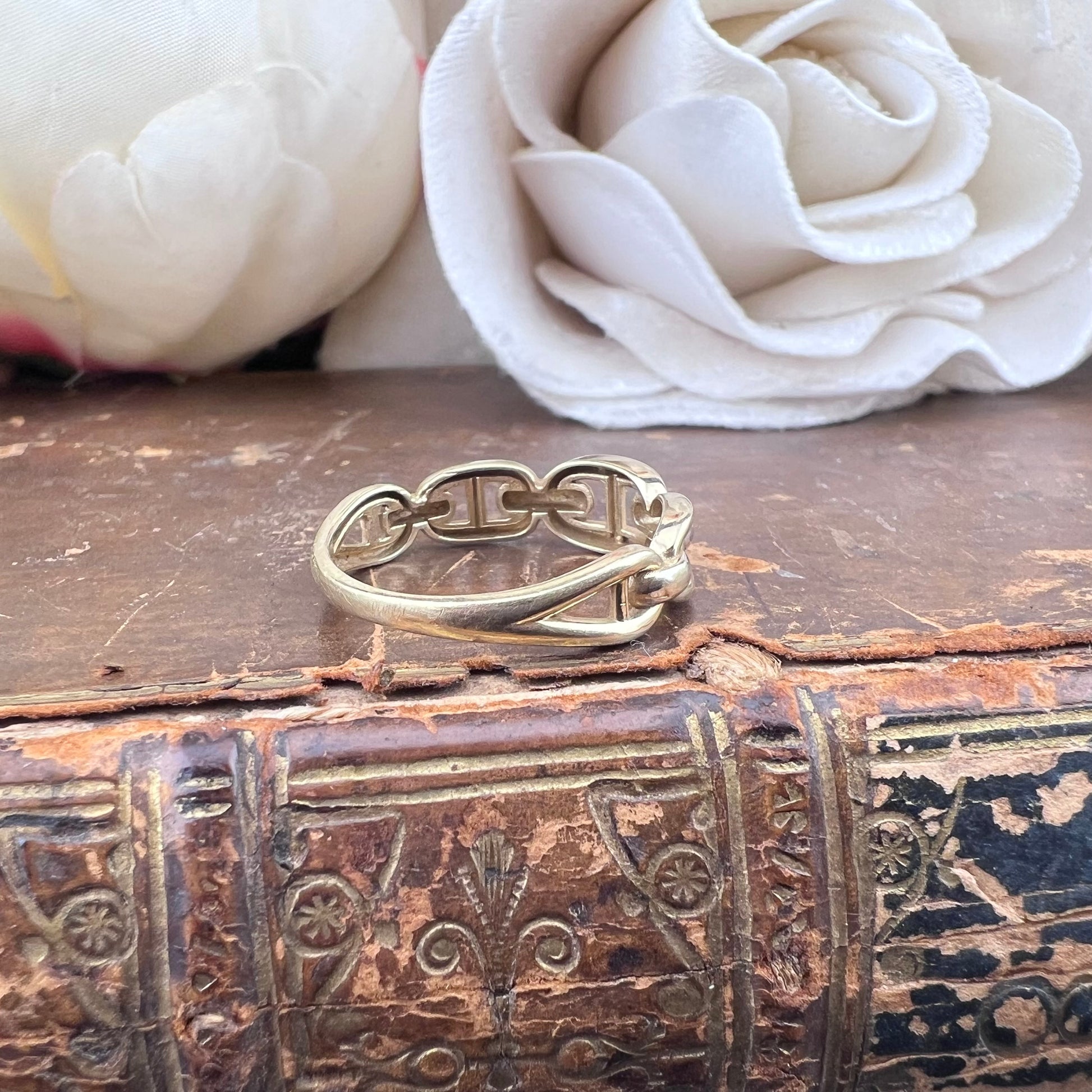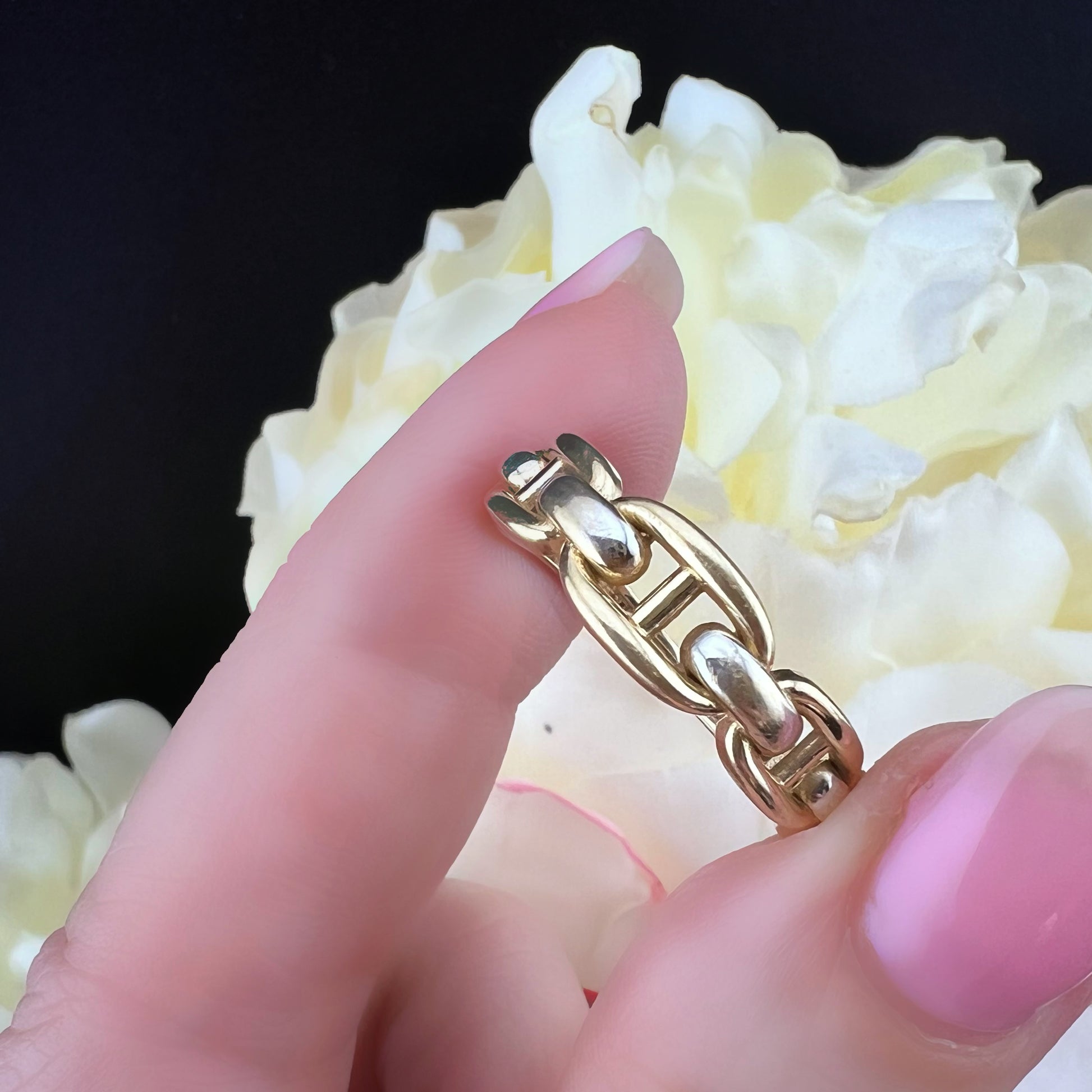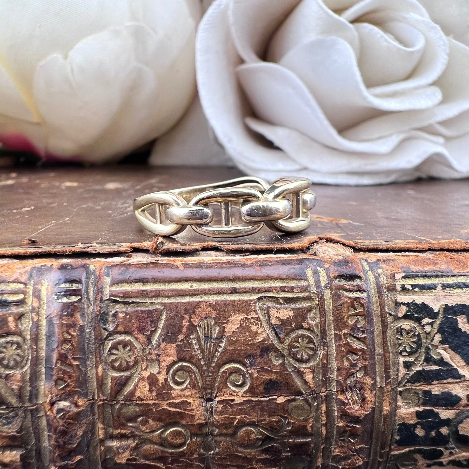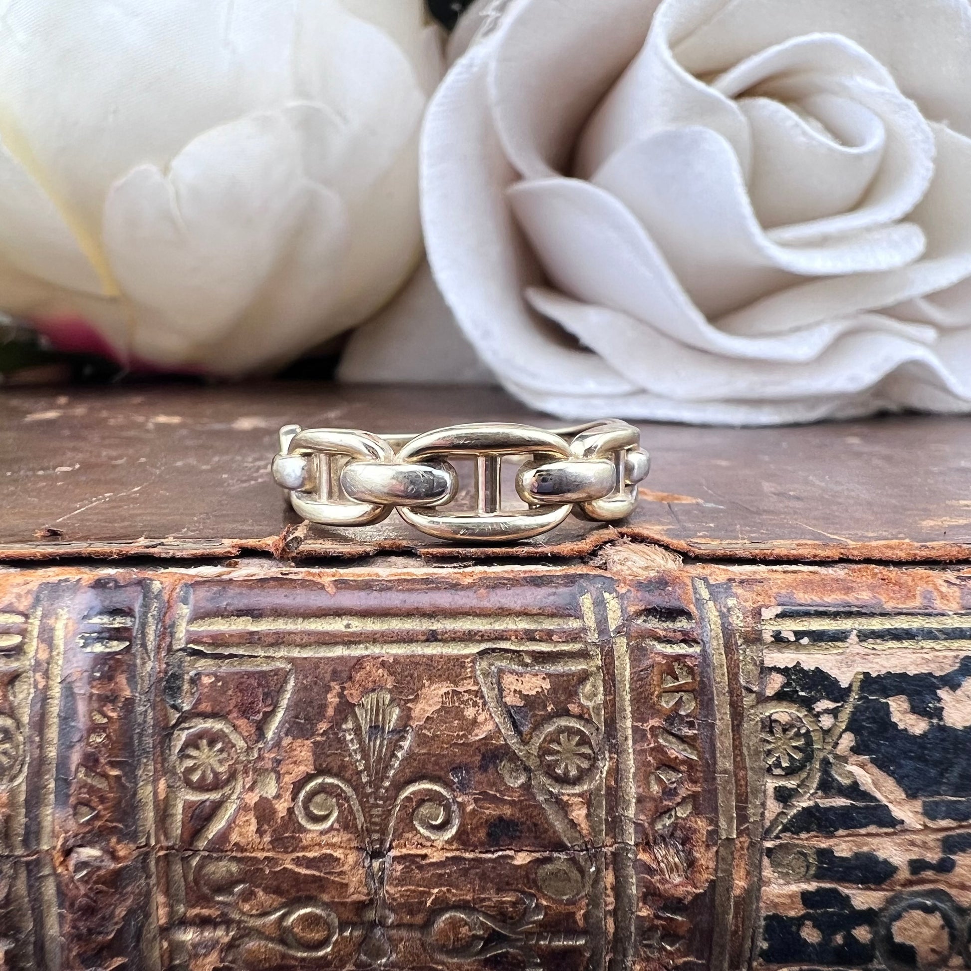 Ein Schmuckstück mit zeitlosem Charme: Dieser englische Vintage-Ring ist mit der charakteristischen Seemannskette aus Gelbgold mit robusten und zugleich raffinierten Gliedern gefertigt. Die rhodinierten Verbindungselemente lassen die Struktur erstrahlen und erzeugen einen eleganten Farbkontrast.