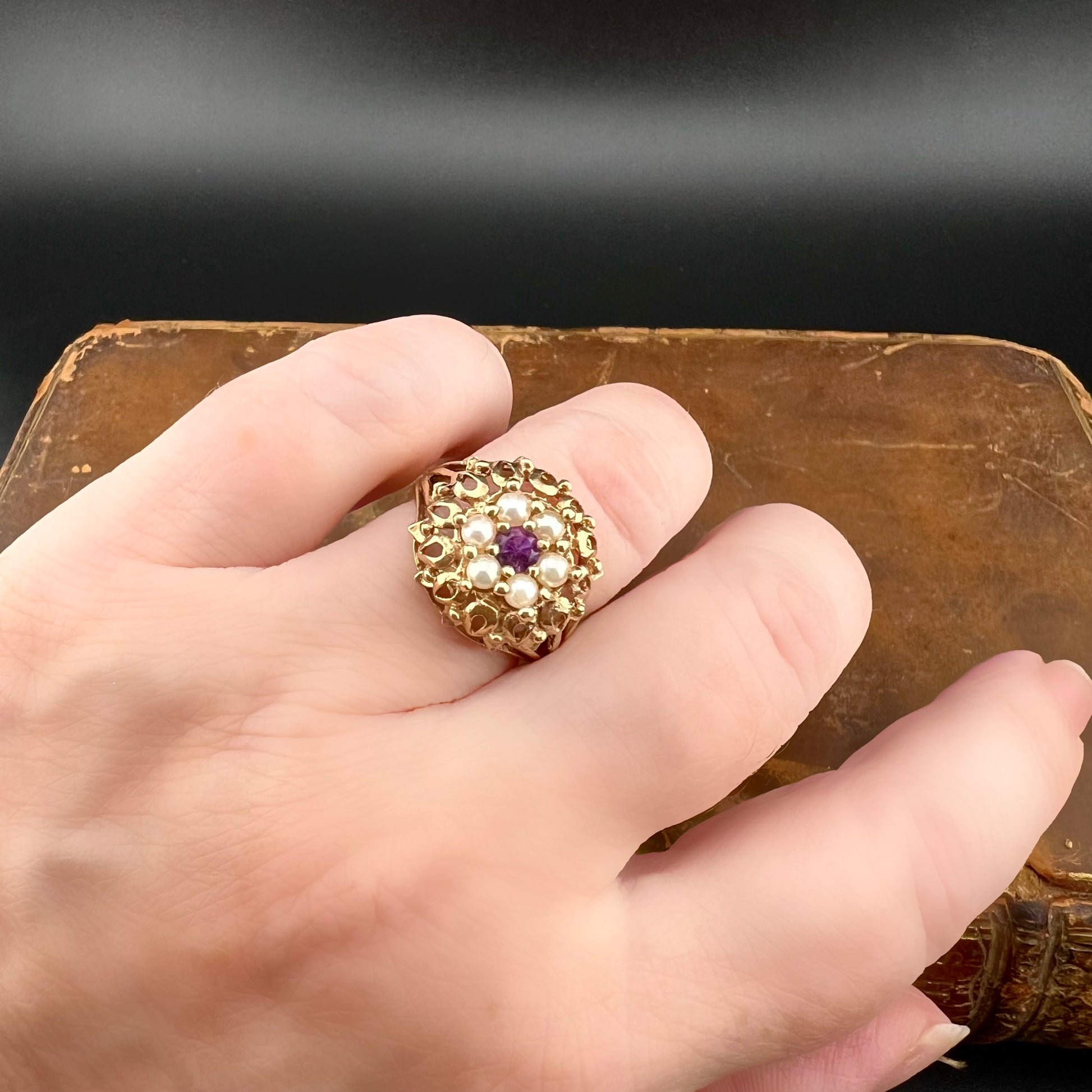 Goldener Gänseblümchenring mit Amethyst und Perlen