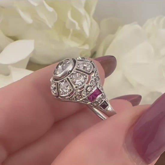 Anello anni ‘20-‘30 in platino con diamanti old mine ct 1.60 totali e rubini