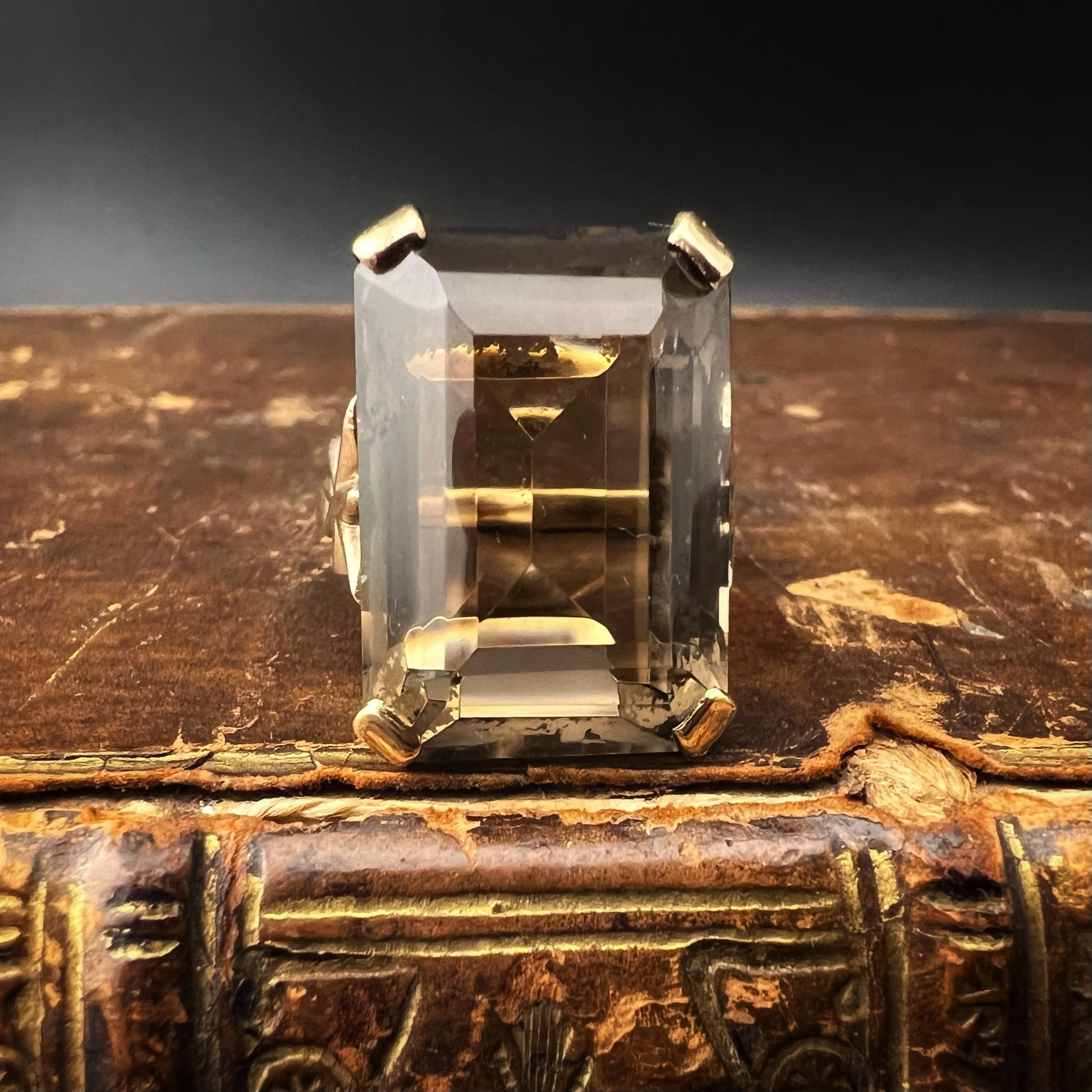 Dieser Vintage-Cocktailring ( hier klicken ) aus den 1970er Jahren, hergestellt in England, ist ein einzigartiges und raffiniertes Schmuckstück, perfekt für alle, die Schmuck mit Retro-Charme lieben. Sein zentraler Edelstein ist ein prächtiger Rauchquarz im Smaragdschliff, groß (1,8 cm x 1,3 cm), transparent und leuchtend. Der Quarz ist in eine rechteckige Korbfassung eingefasst, die durchbrochen gearbeitet ist und so für einen leichten und eleganten optischen Effekt sorgt.