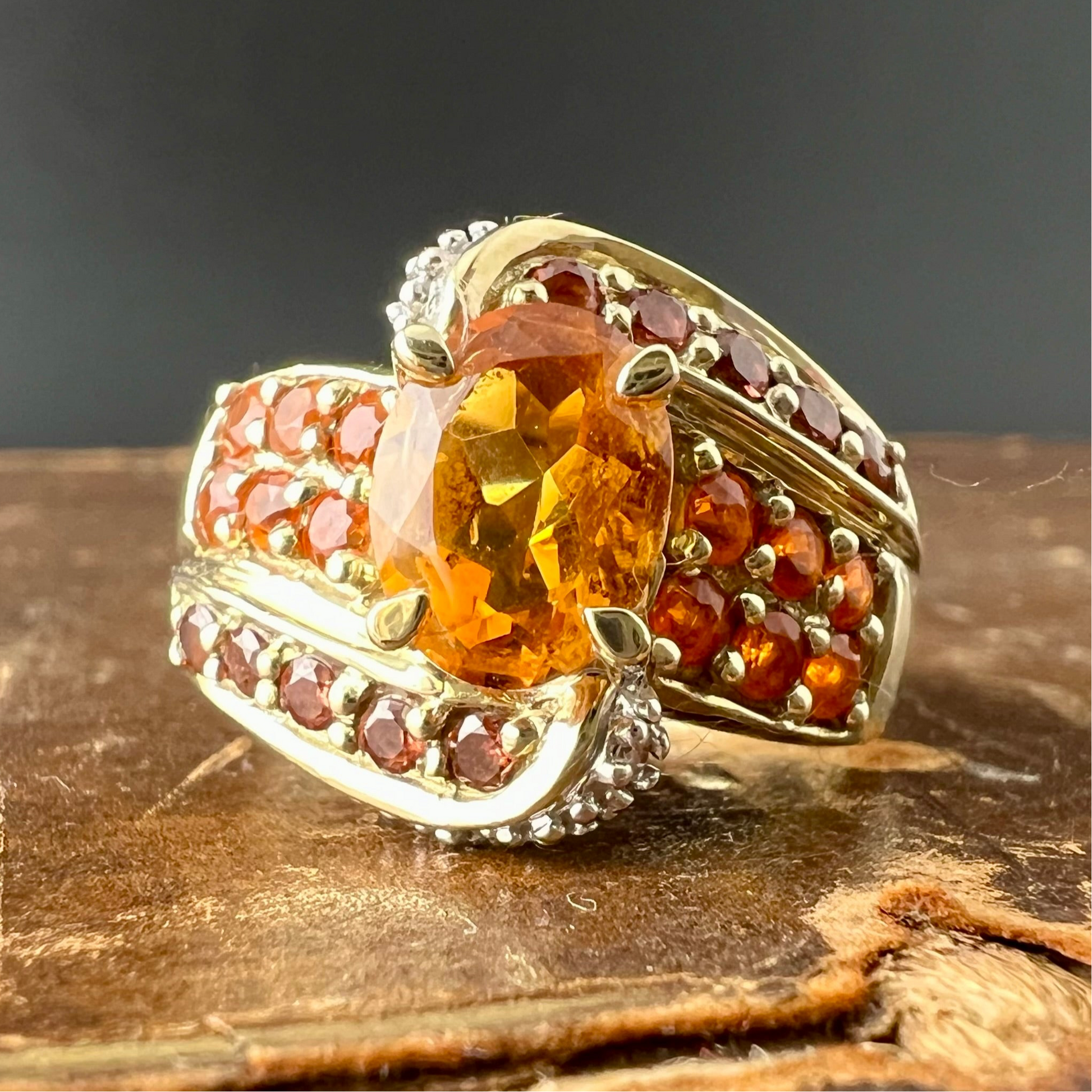 Bezaubernder, großer Vintage-Ring mit einem leuchtend orangefarbenen Citrin in der Mitte. Das elegante Design wird durch Reihen von Feueropalen im Rundschliff, die die Mitte der Ringschiene schmücken, zusätzlich unterstrichen. Zwei kleine Diamantpunkte ergänzen die Opalwelle und verleihen ihr einen Hauch von Brillanz.