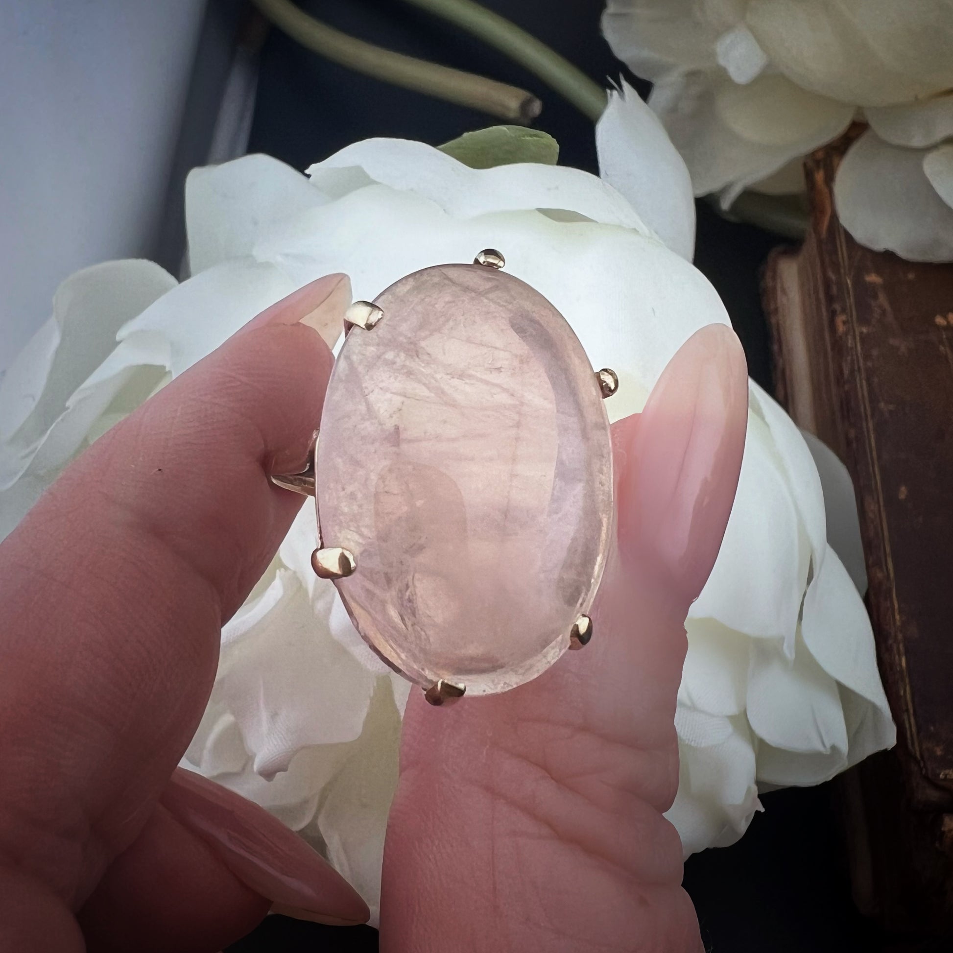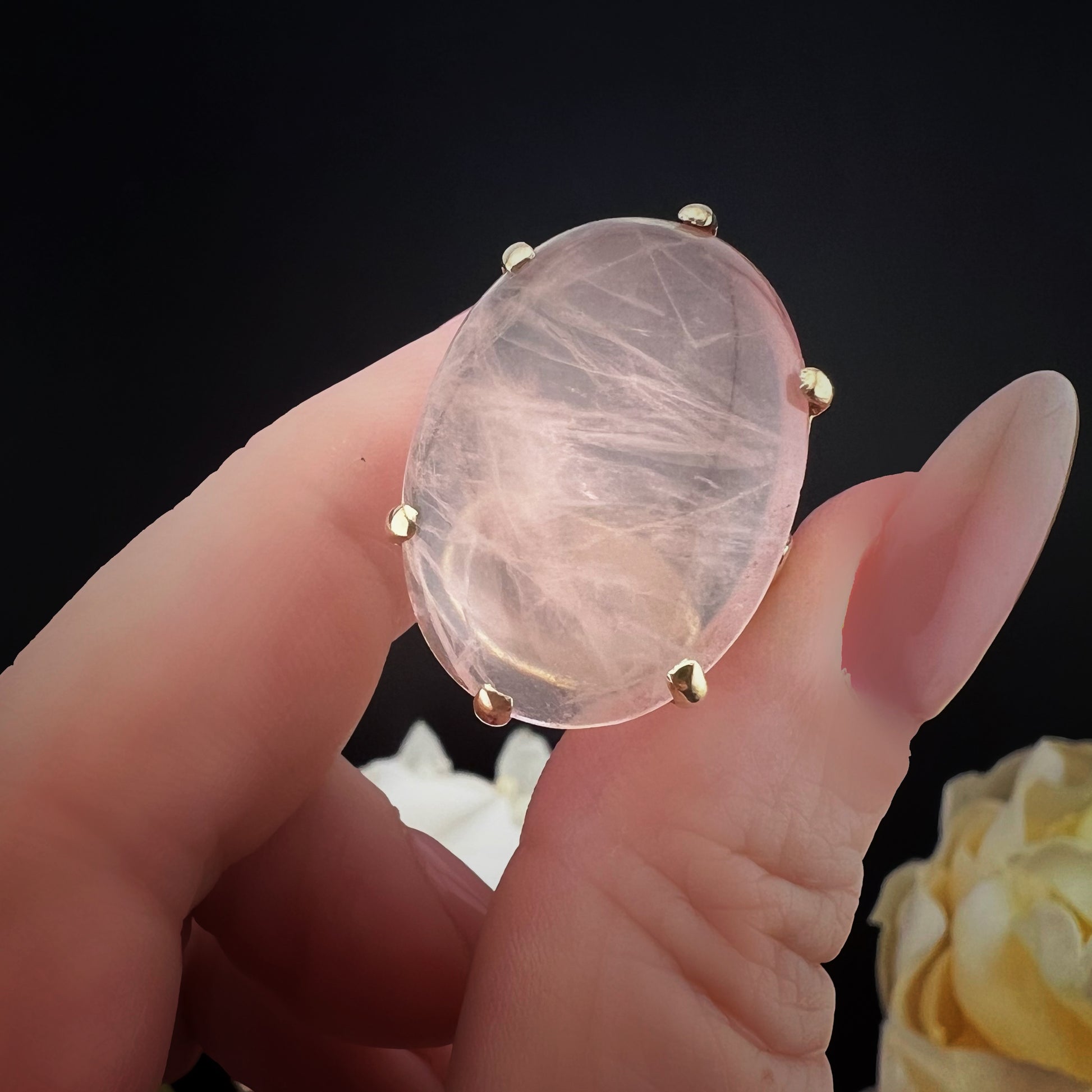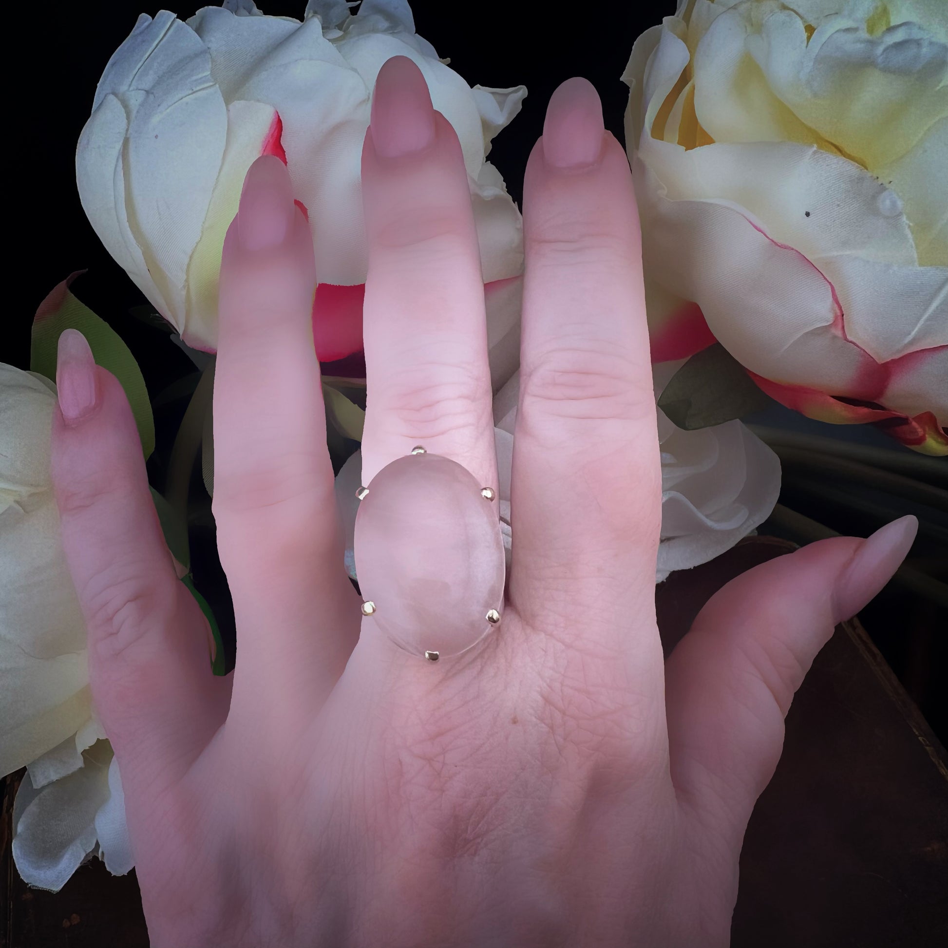 Ein dramatischer und raffinierter Cocktailring, dominiert von einem großen, beeindruckend großen (24 x 18 mm) Cabochon aus Rutil-Rosenquarz mit fast ätherischer Anmutung. Der blassrosa Farbton des Steins, kombiniert mit seiner Transparenz, die die zarten Fasern im Inneren freigibt, erzeugt einen beeindruckenden visuellen Effekt und verschmilzt mit der Haut in einem Spiel zarter, schillernder Reflexe.