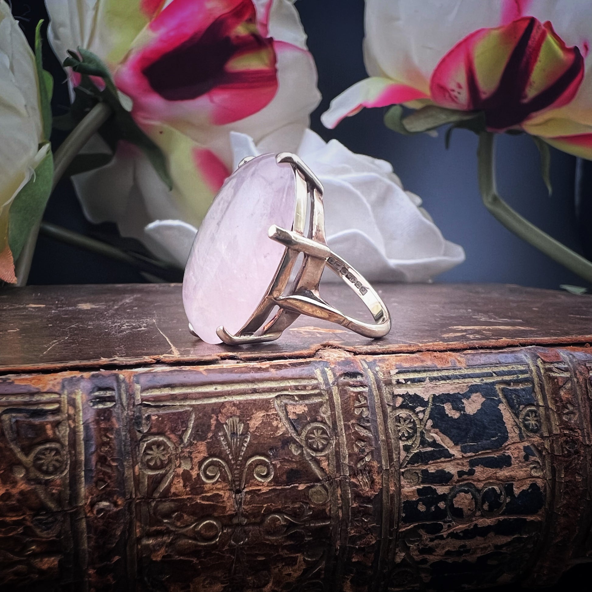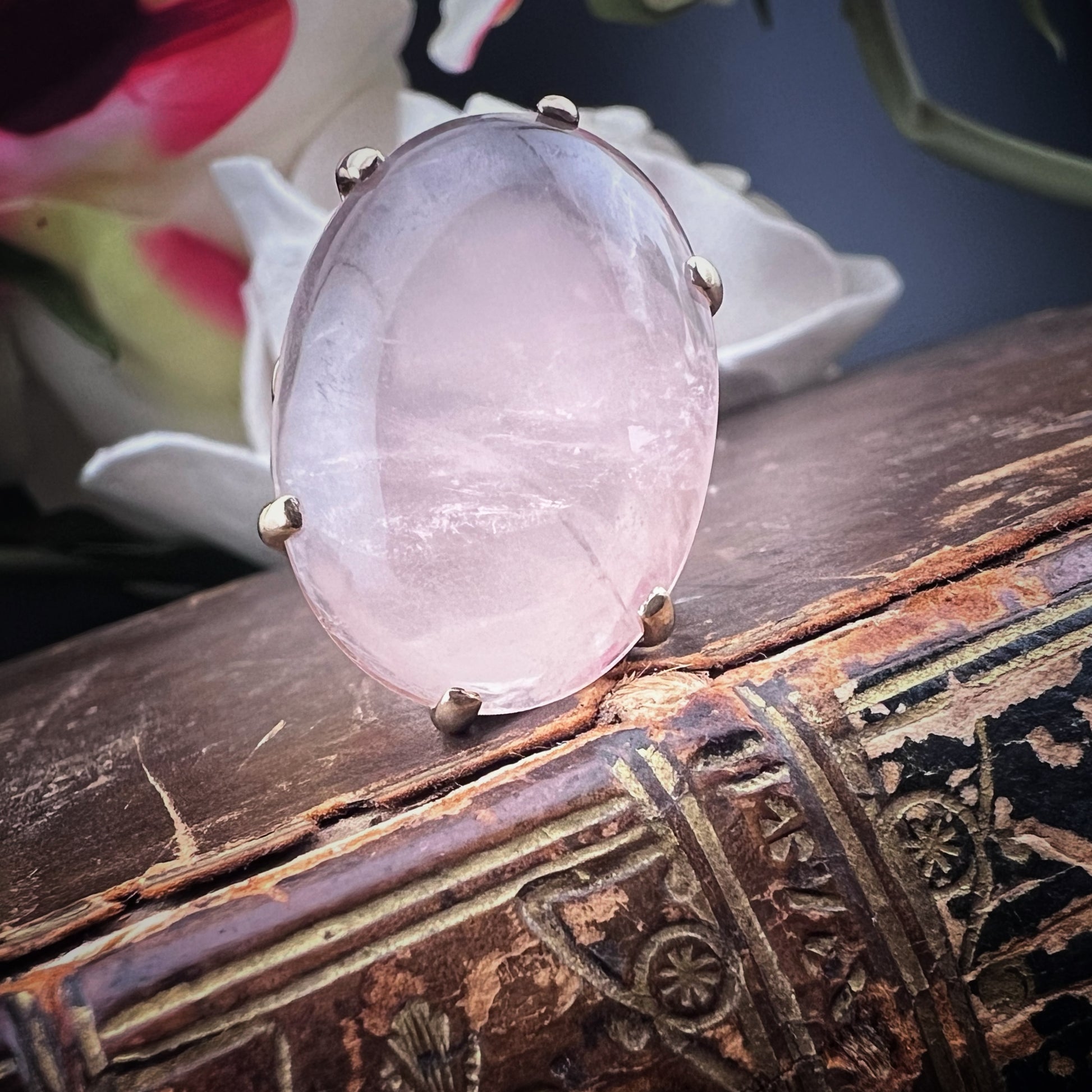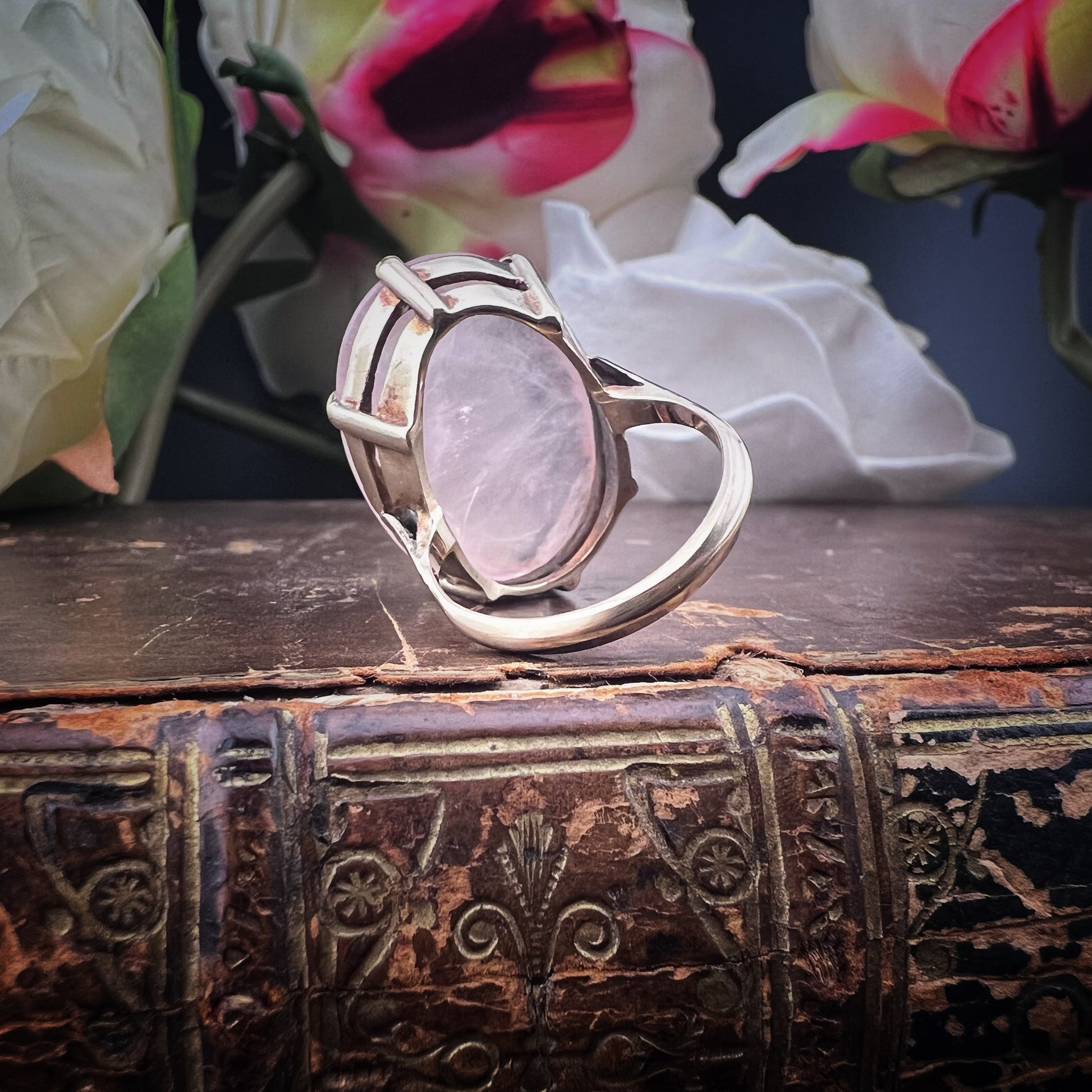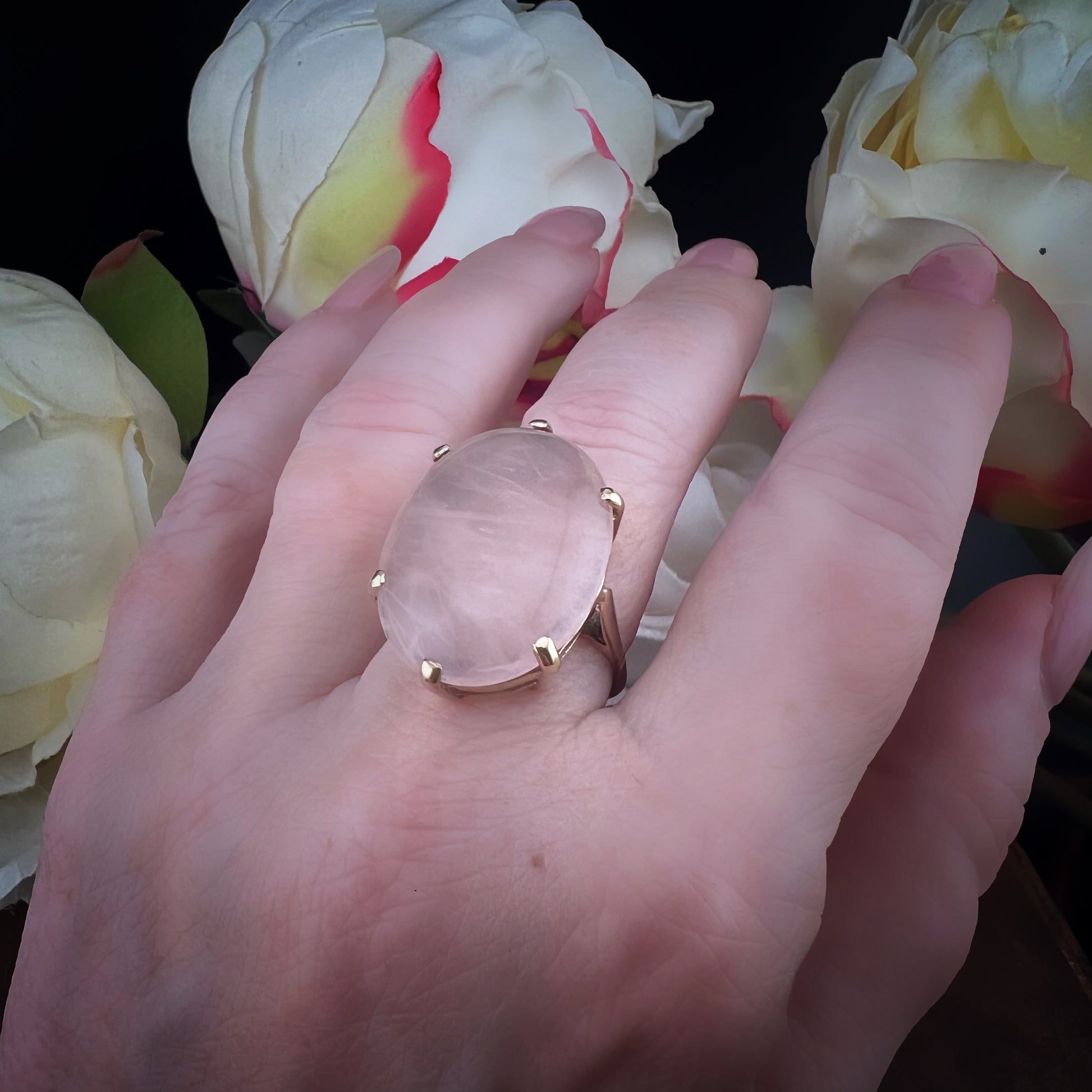 Ein dramatischer und raffinierter Cocktailring, dominiert von einem großen, beeindruckend großen (24 x 18 mm) Cabochon aus Rutil-Rosenquarz mit fast ätherischer Anmutung. Der blassrosa Farbton des Steins, kombiniert mit seiner Transparenz, die die zarten Fasern im Inneren freigibt, erzeugt einen beeindruckenden visuellen Effekt und verschmilzt mit der Haut in einem Spiel zarter, schillernder Reflexe.
