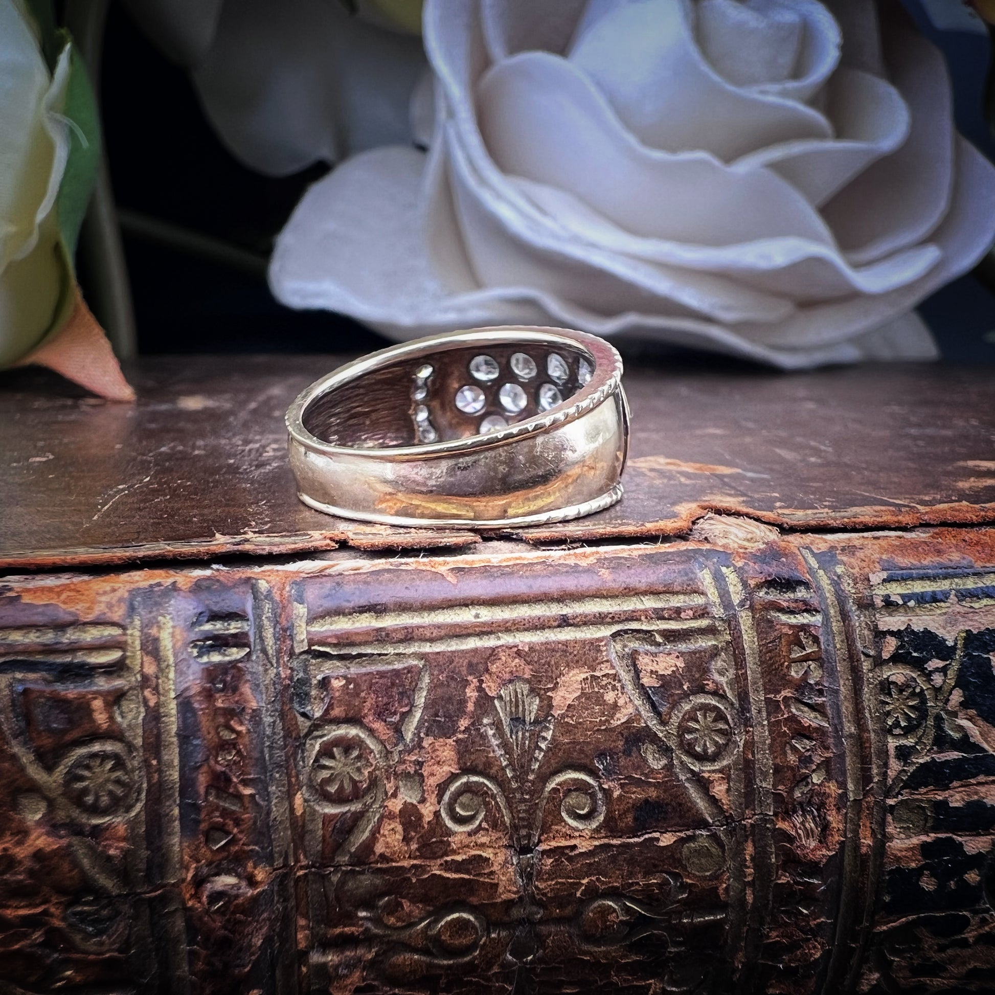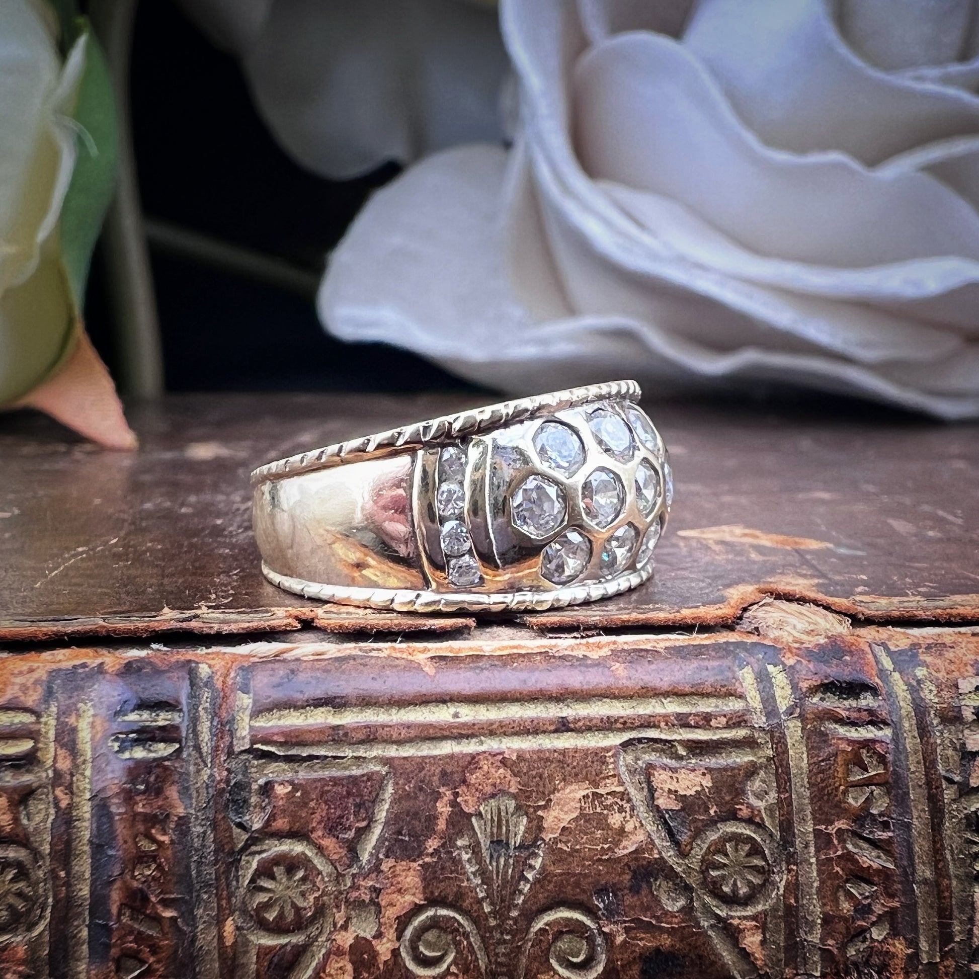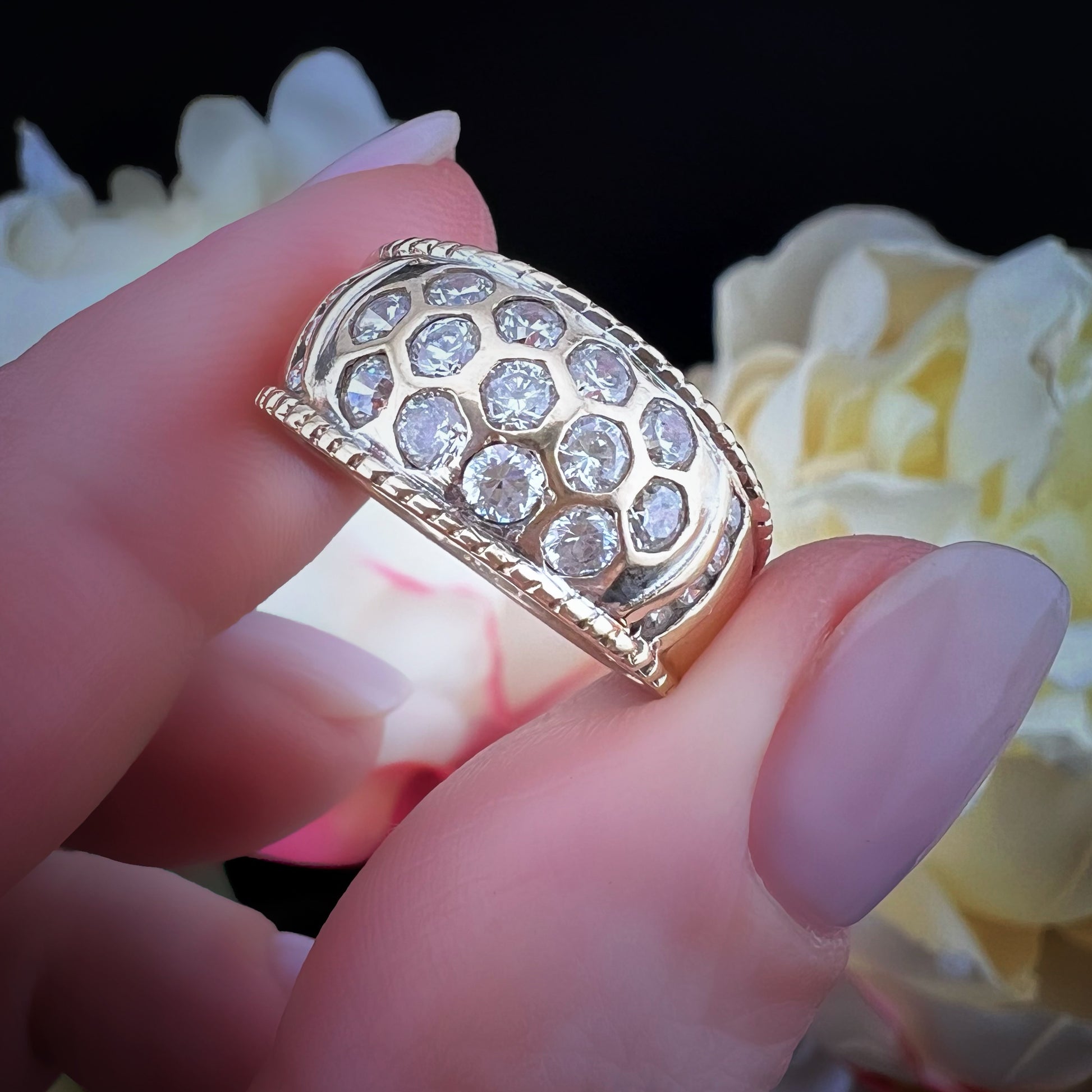 Auffällig, schillernd und zeitlos: Dieser Vintage-Bandring aus 9-karätigem Gelbgold, der zwischen den 1970er und 1990er Jahren in London gefertigt wurde, ist ein Statement. Das geschwungene Design mit elegant geriffelten Kanten ist vollständig mit Zirkonia im Brillantschliff besetzt, dicht und doch harmonisch gefasst für einen markanten, schillernden Effekt.
