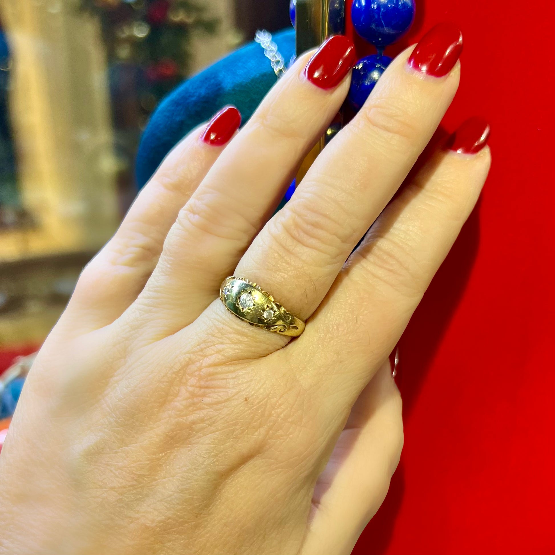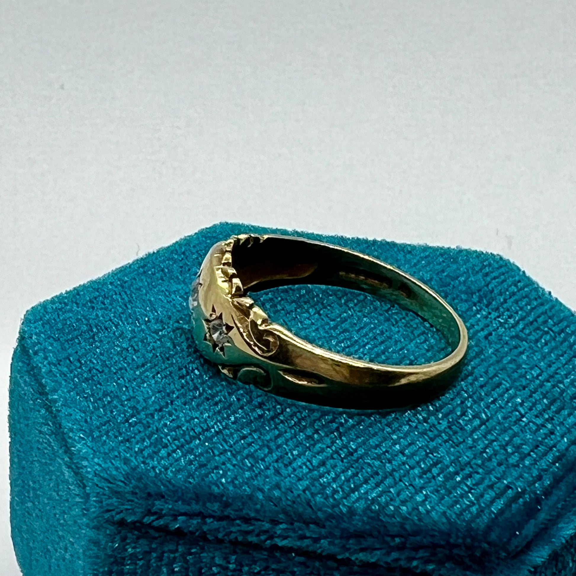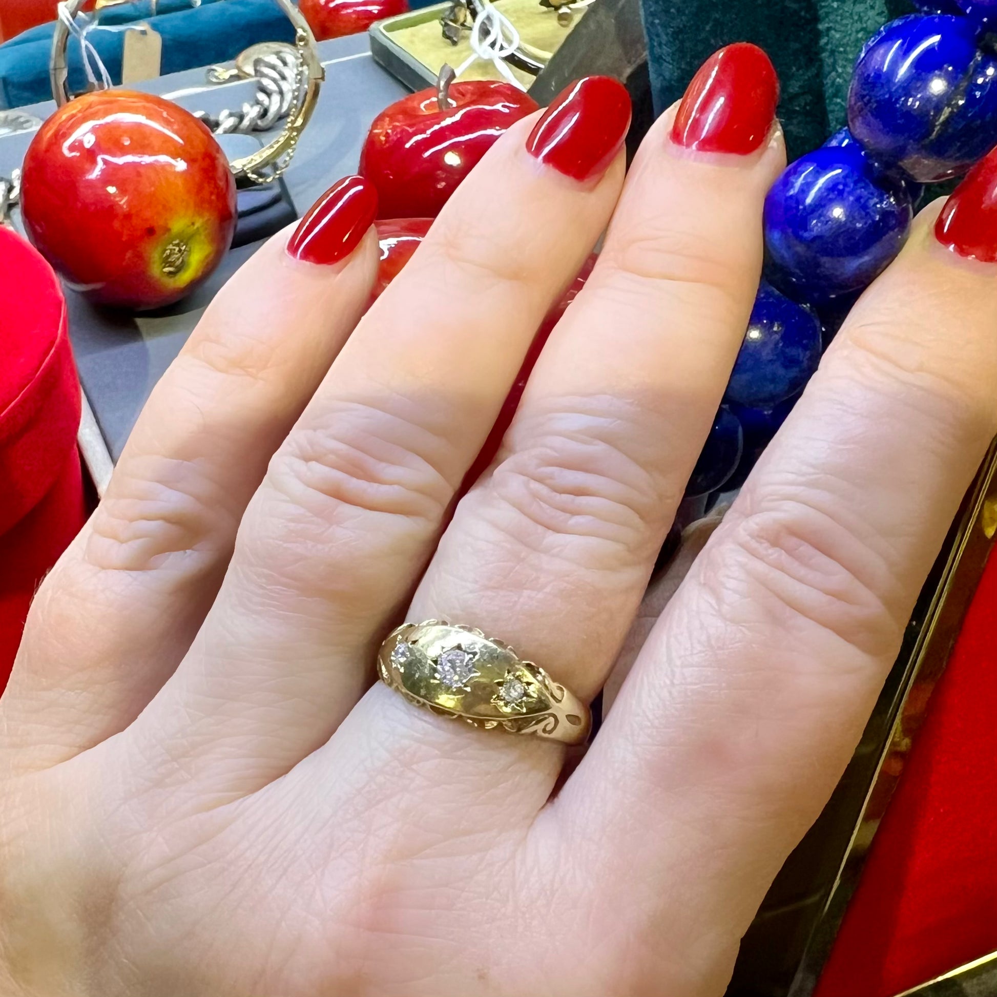 Vintage-Bandring mit einem bezaubernden Spitzenrand. Drei brillante, farblose Quarzsteine sind bündig eingefasst und mit einer sternförmigen Gravur versehen. Der sogenannte „Gypsy-Stil“ war in England seit der viktorianischen Zeit sehr beliebt. Gefertigt aus 9-karätigem Gelbgold, ganz im Sinne der englischen Tradition.