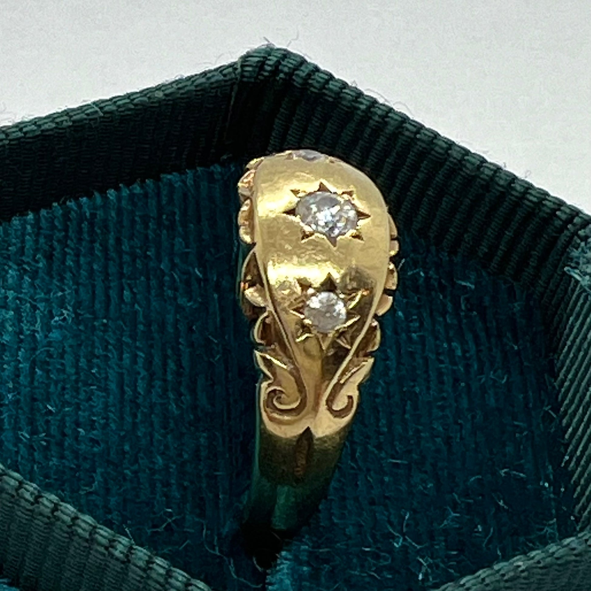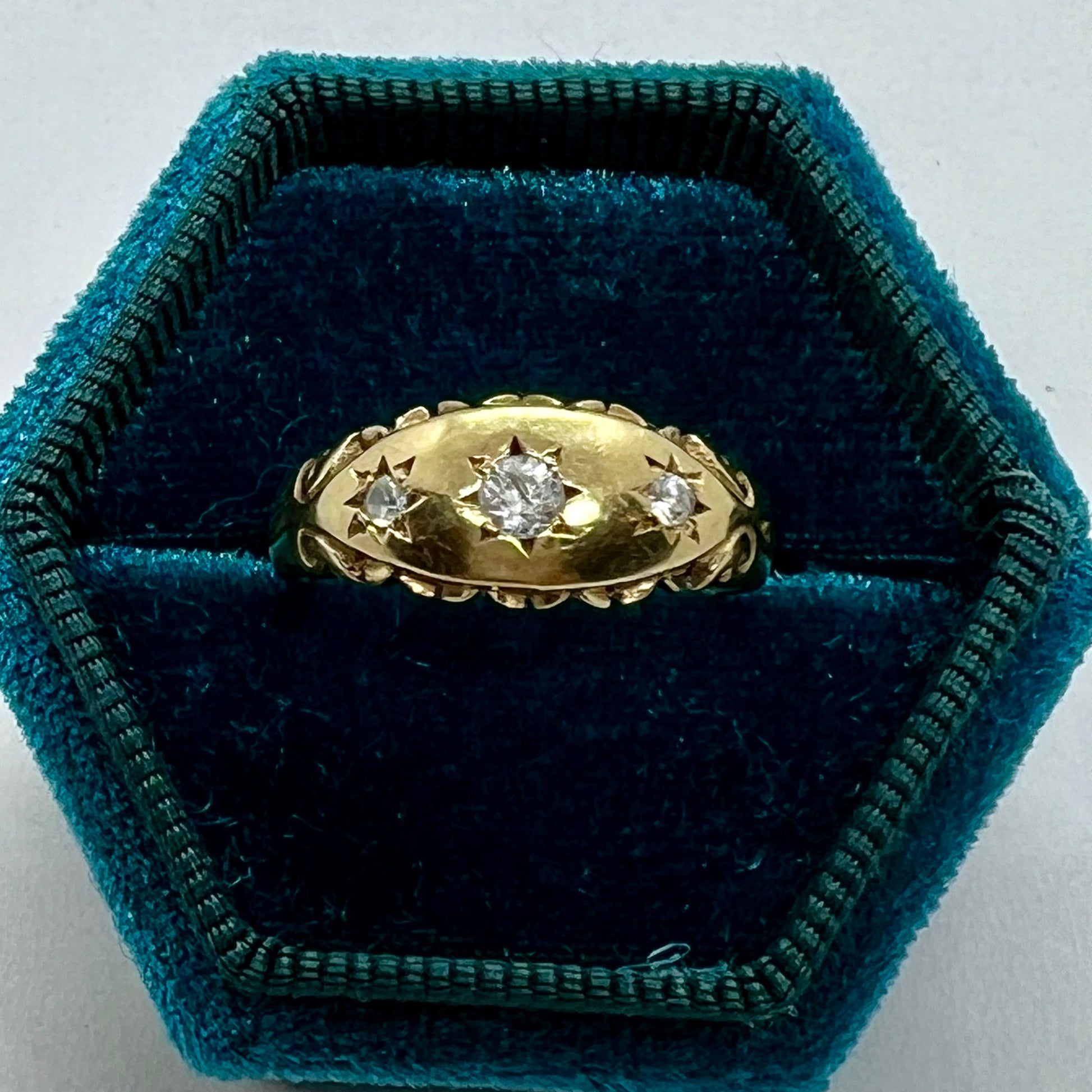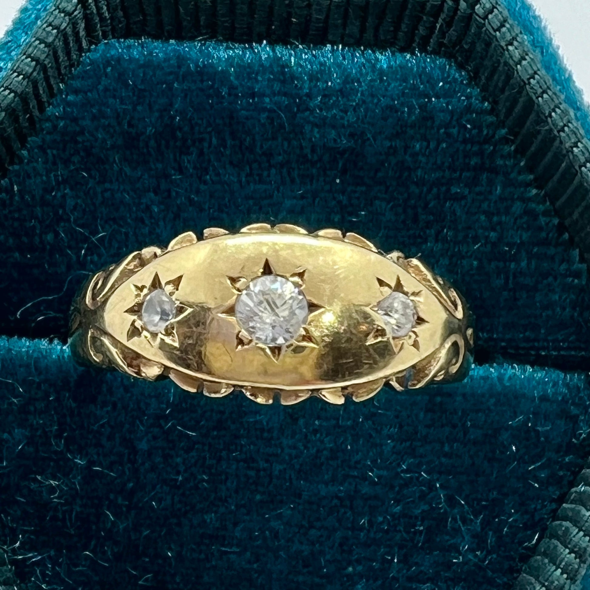 Vintage-Bandring mit einem bezaubernden Spitzenrand. Drei brillante, farblose Quarzsteine sind bündig eingefasst und mit einer sternförmigen Gravur versehen. Der sogenannte „Gypsy-Stil“ war in England seit der viktorianischen Zeit sehr beliebt. Gefertigt aus 9-karätigem Gelbgold, ganz im Sinne der englischen Tradition.