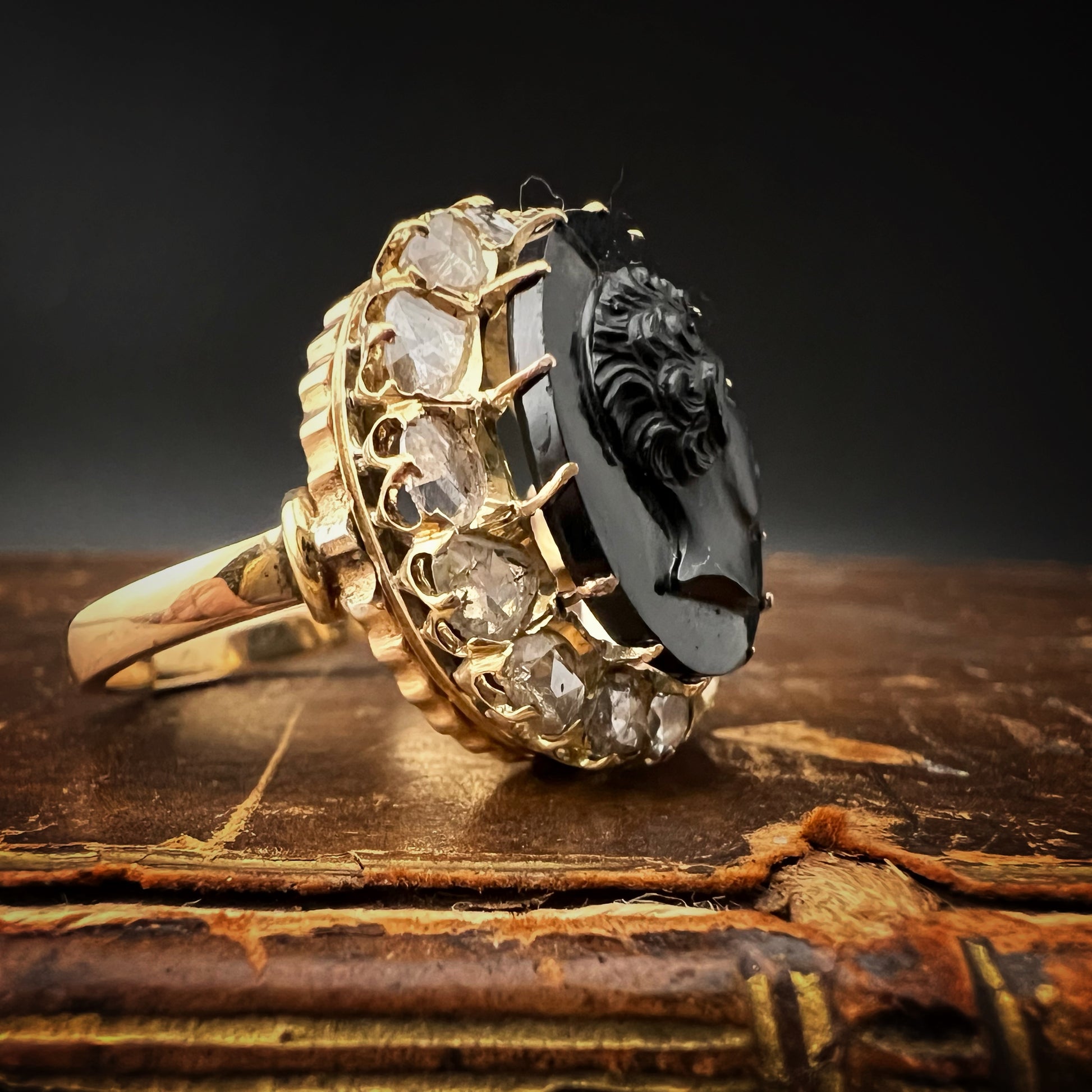 Onyx wurde besonders wegen seiner Tiefe und seiner Fähigkeit, künstlerische Details hervorzuheben, geschätzt, was ihn perfekt für raffinierte skulpturale Darstellungen wie die in diesem Ring gezeigte machte.