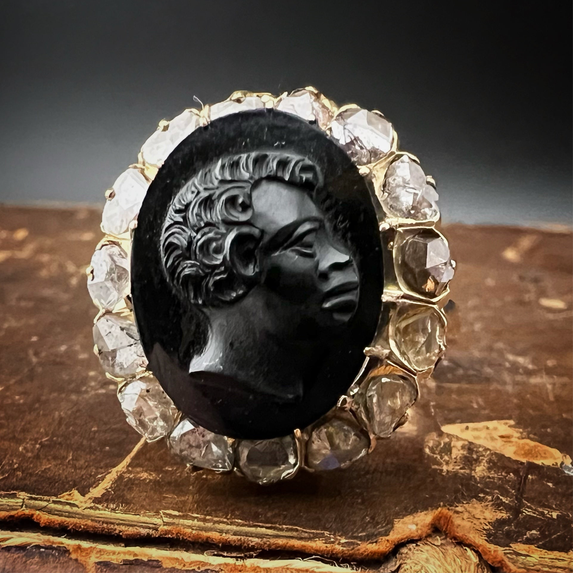 Dieser außergewöhnliche antike Ring zeigt eine Onyx-Skulptur eines Mohren, ein beliebtes Motiv im traditionellen Schmuck.