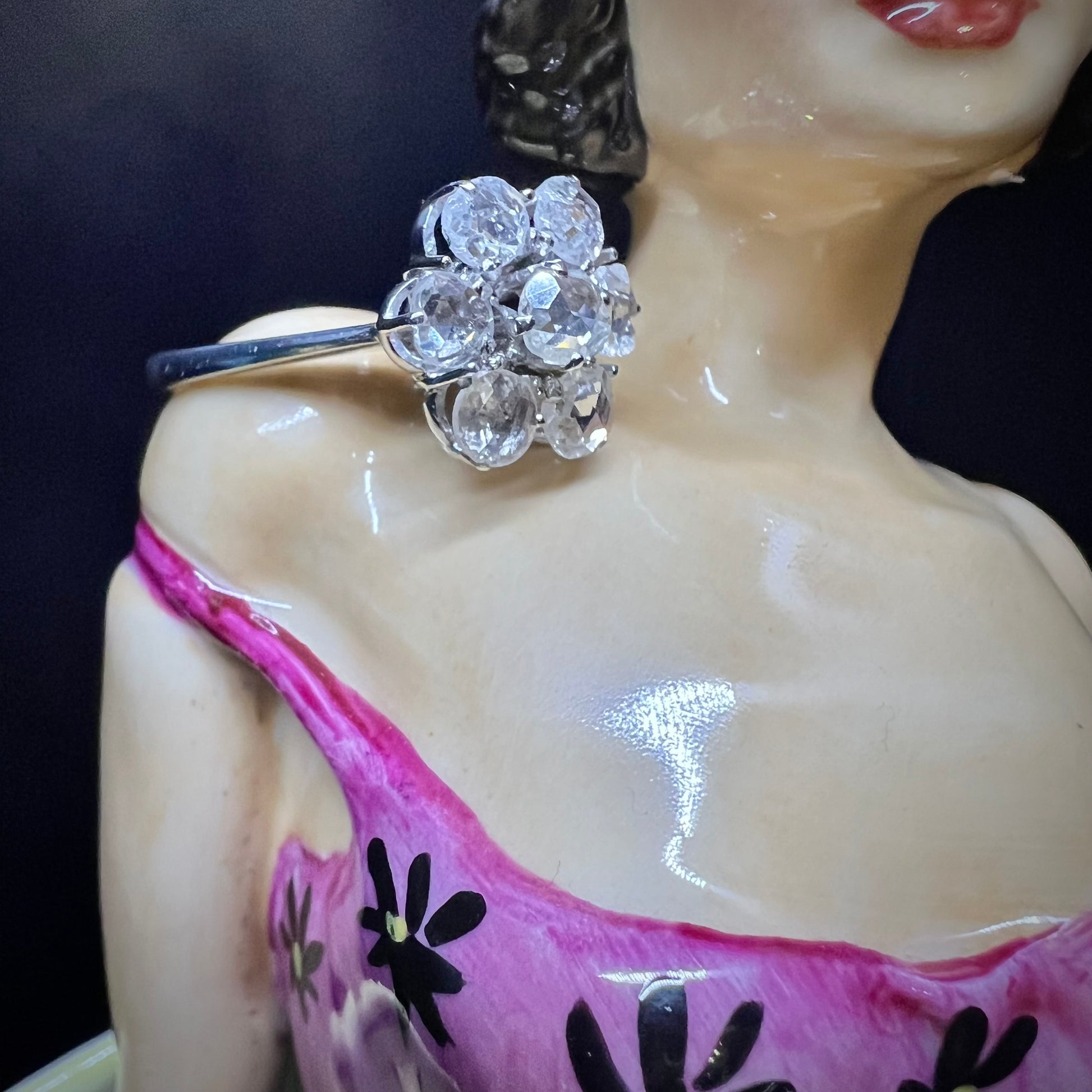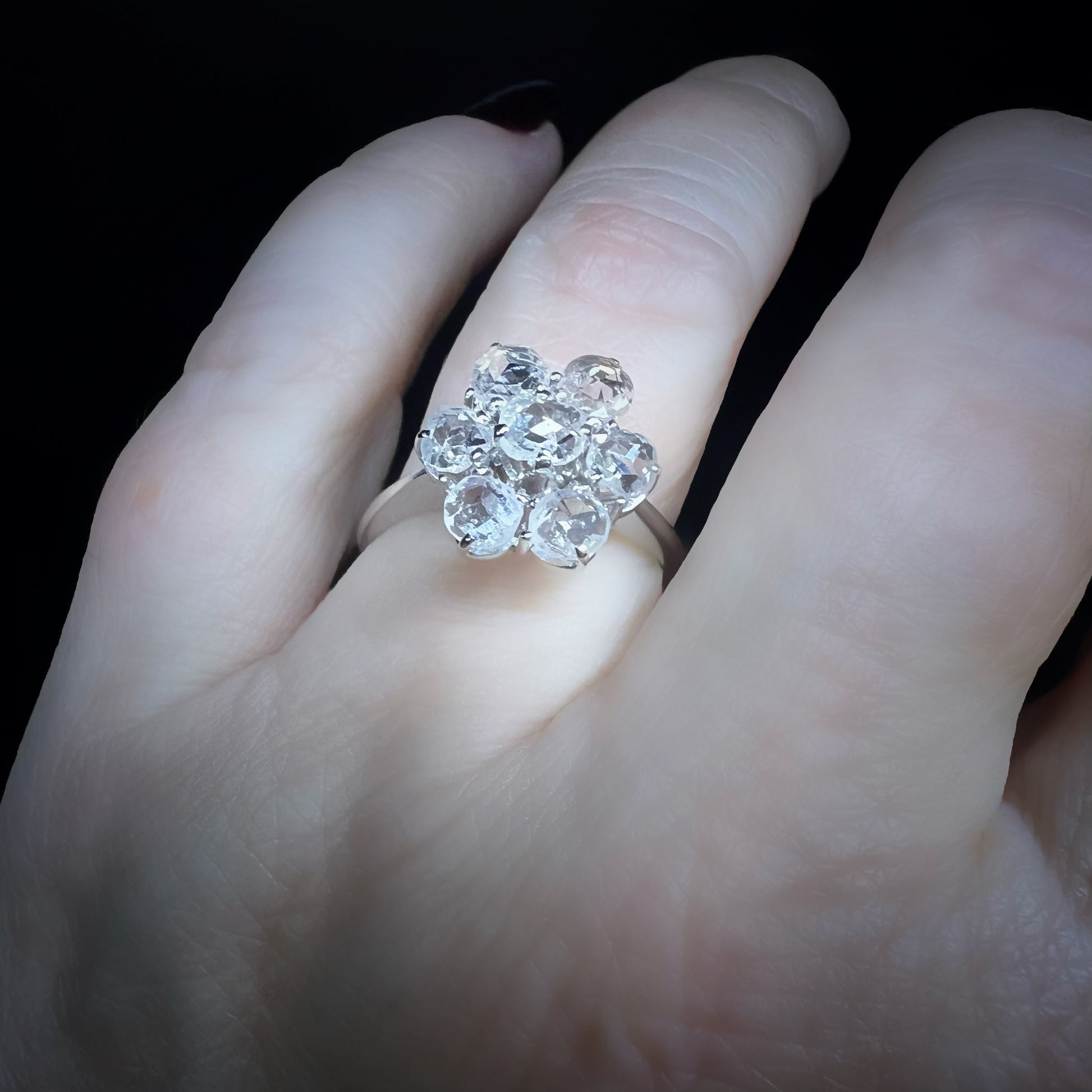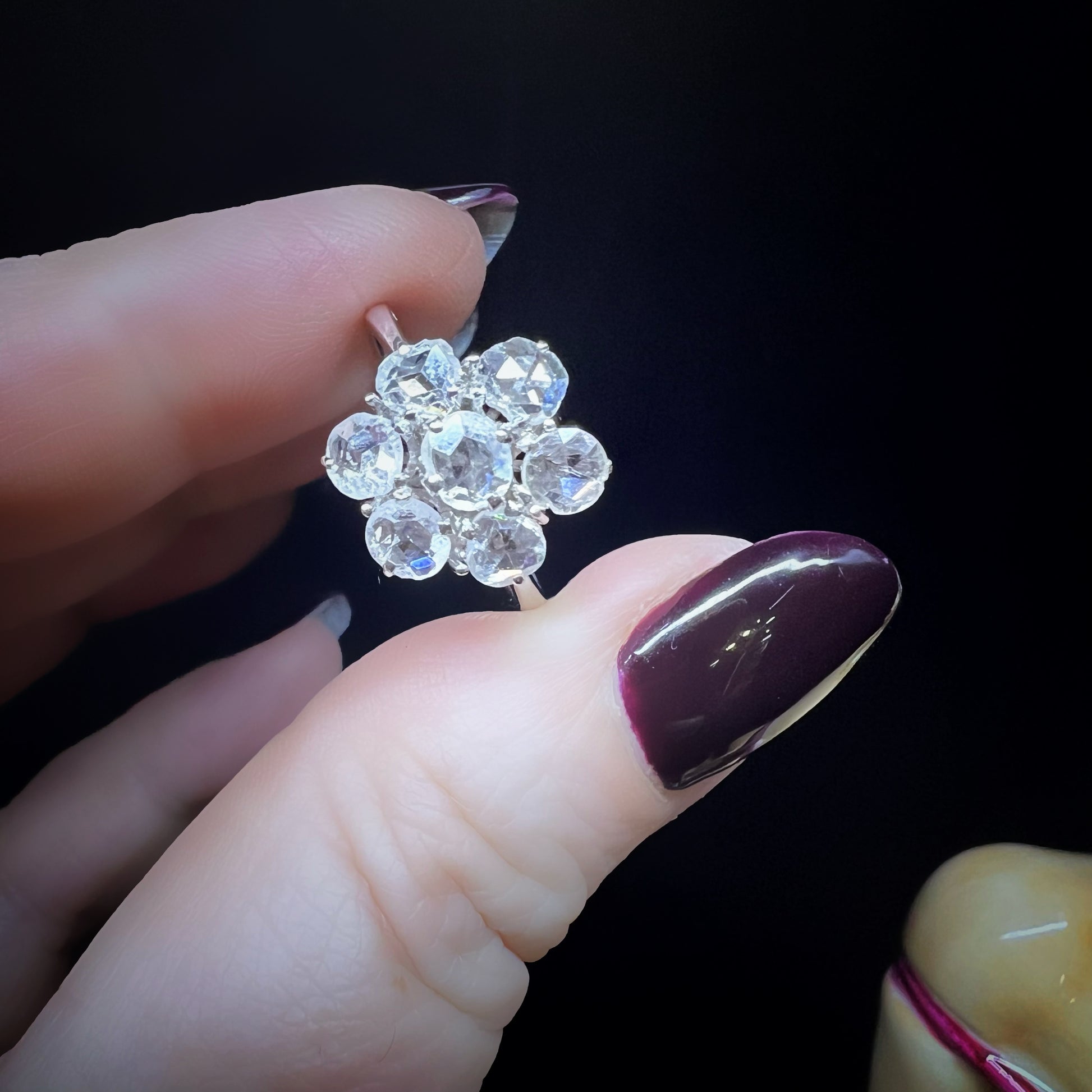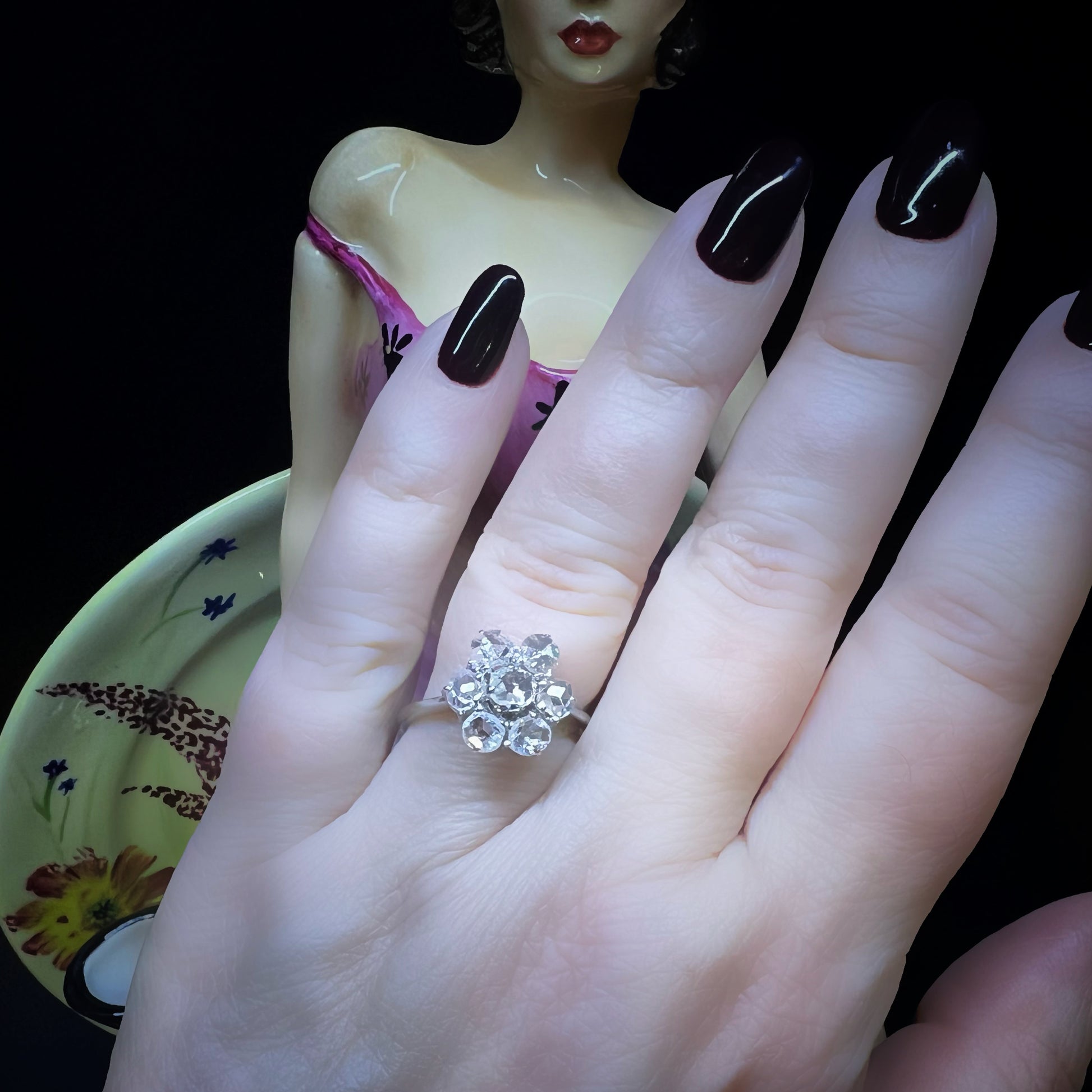 Ein raffinierter Ring aus den 1930er Jahren mit einem romantischen Design, das an die Zartheit einer Gänseblümchen erinnert. Er verfügt über einen leuchtenden zentralen Diamanten, der von sechs Diamanten im Rosenschliff umgeben ist und so einen funkelnden und eleganten Effekt erzeugt.