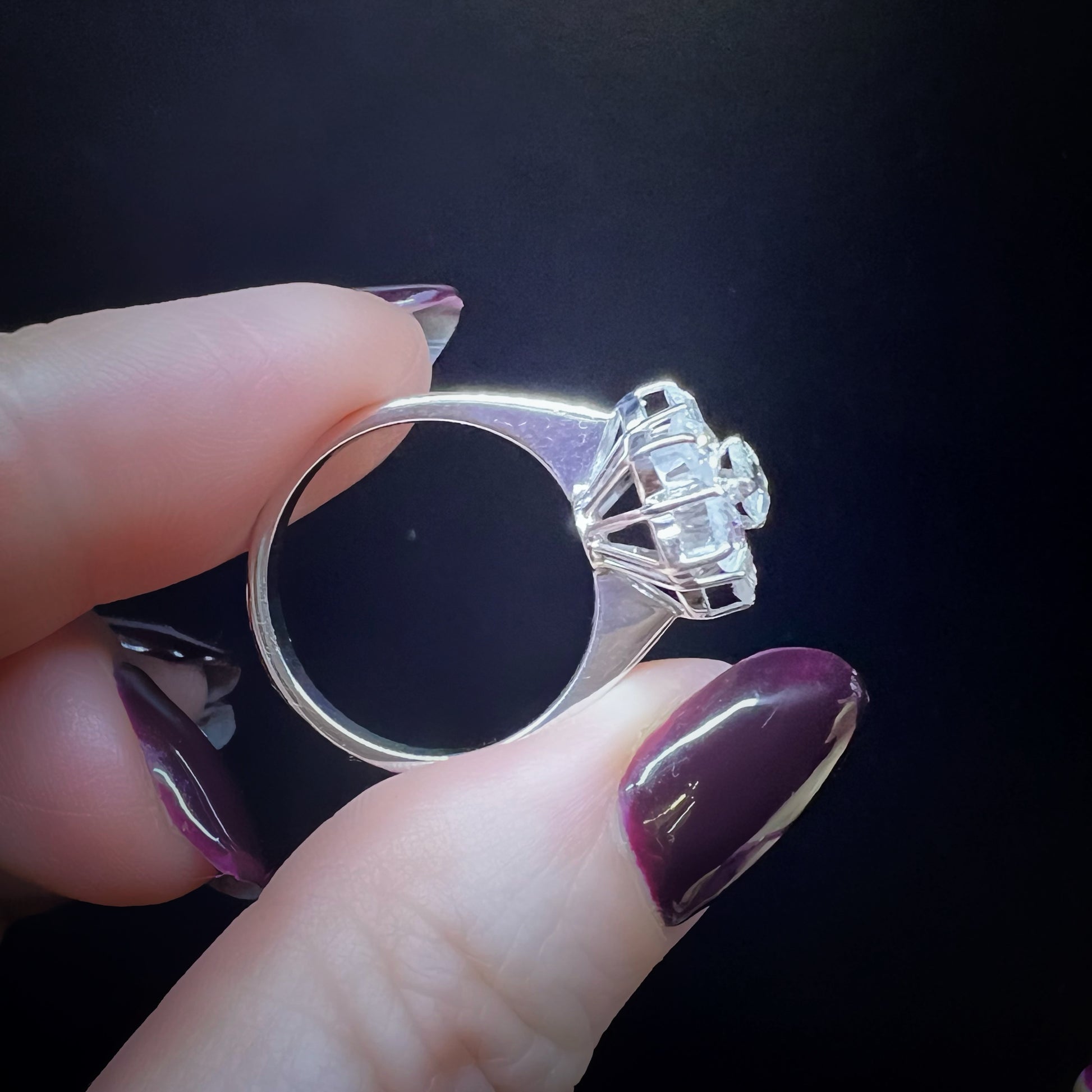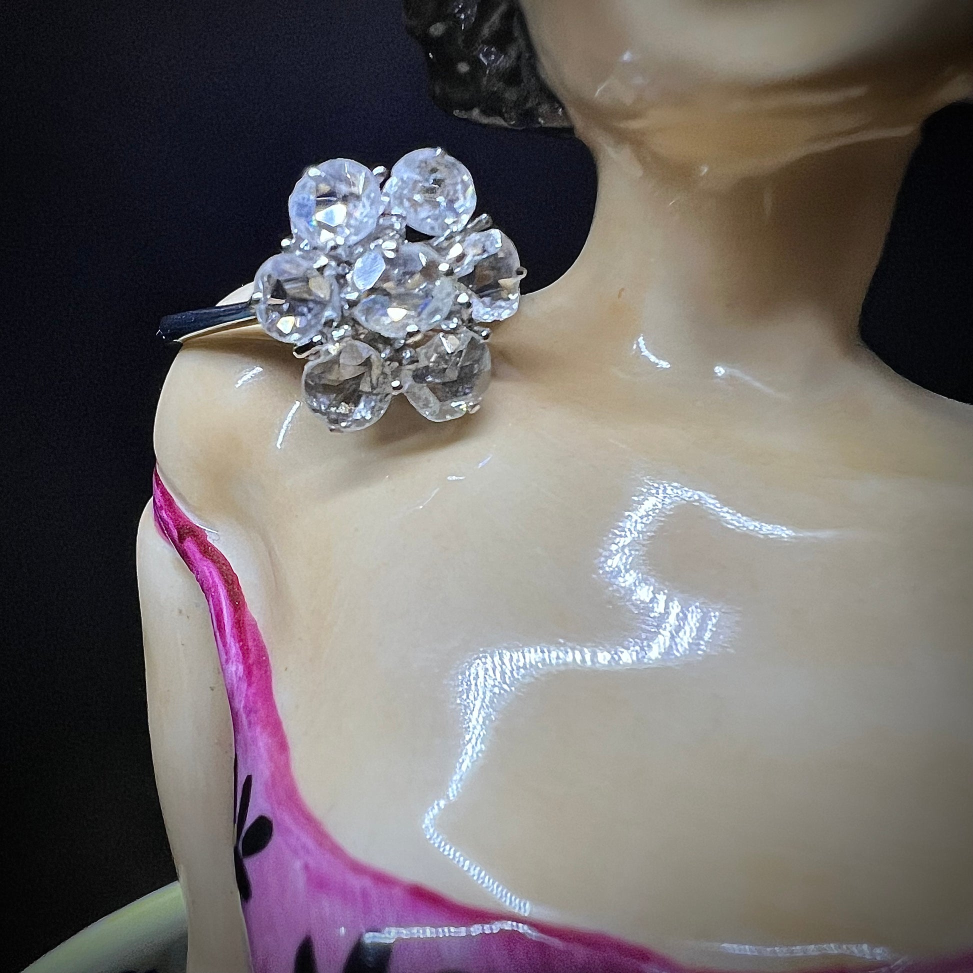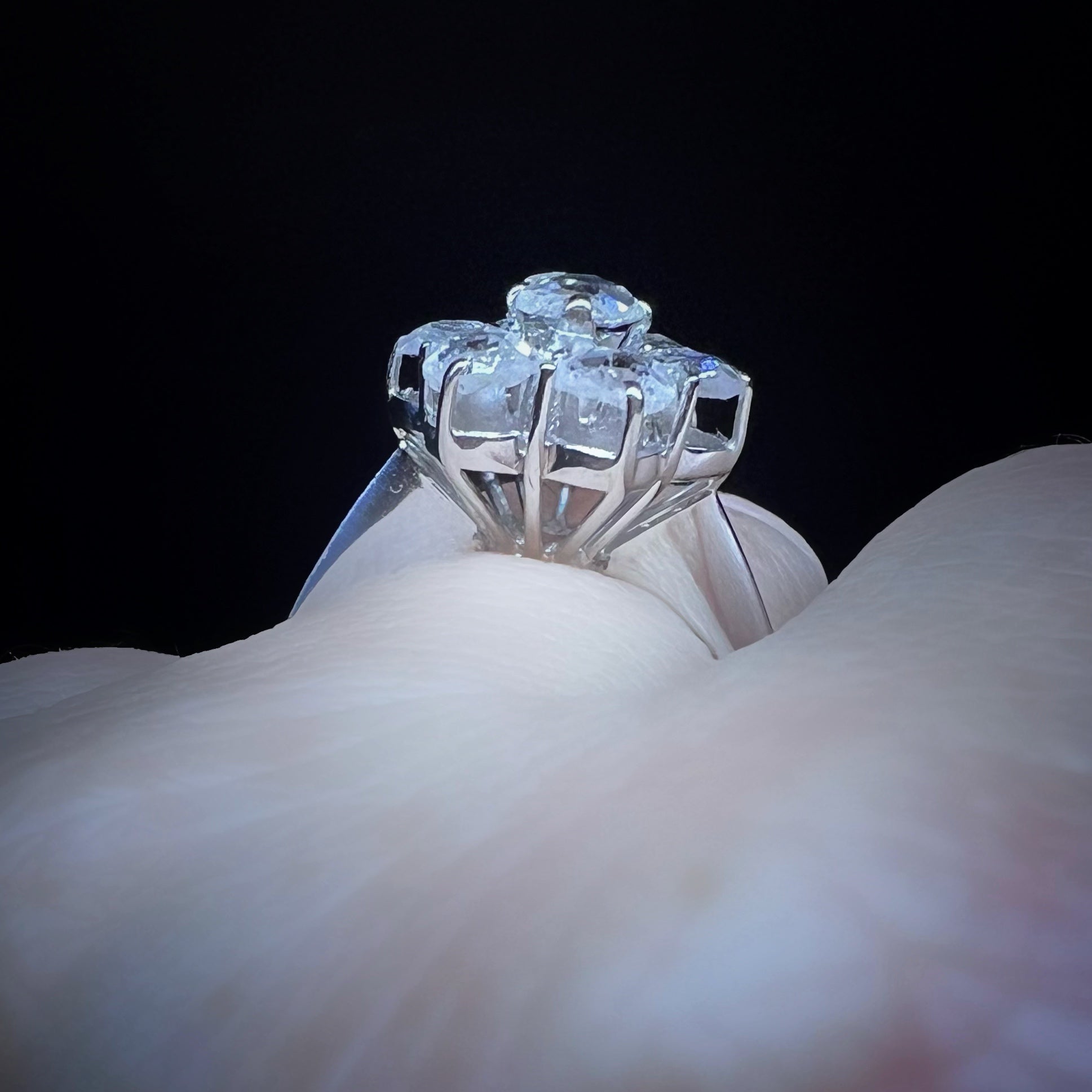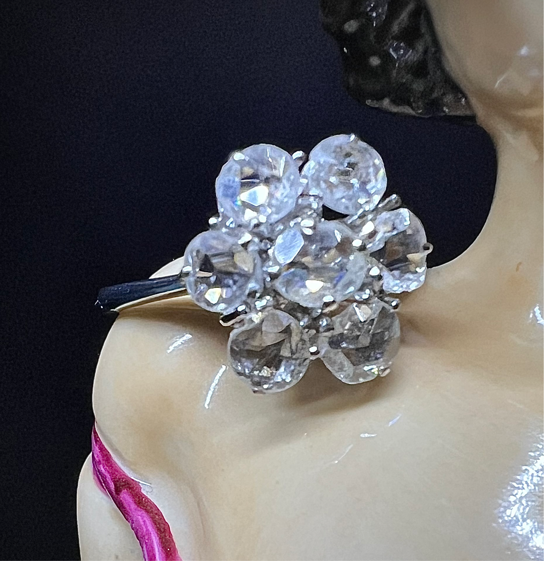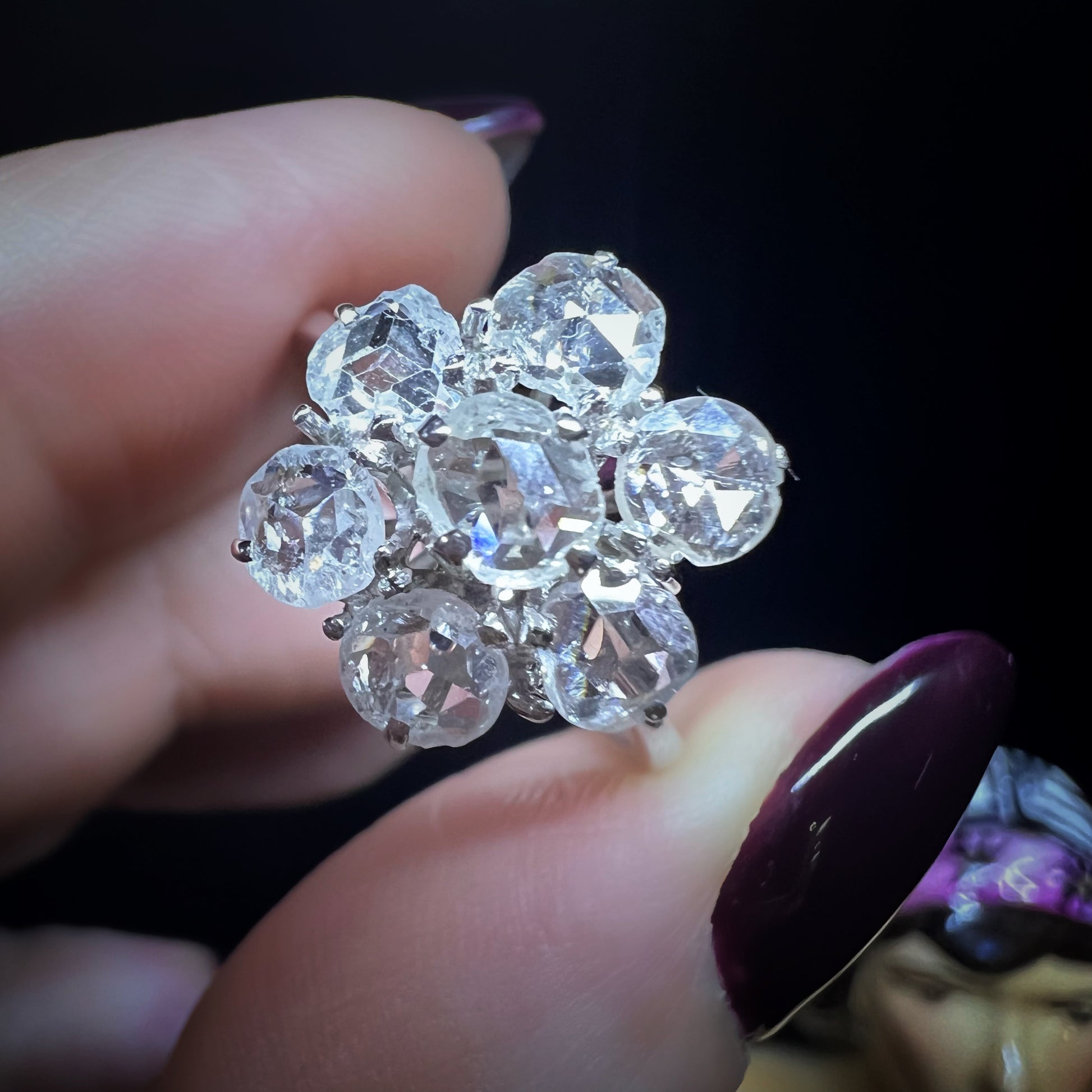 Ein raffinierter Ring aus den 1930er Jahren mit einem romantischen Design, das an die Zartheit einer Gänseblümchen erinnert. Er verfügt über einen leuchtenden zentralen Diamanten, der von sechs Diamanten im Rosenschliff umgeben ist und so einen funkelnden und eleganten Effekt erzeugt.