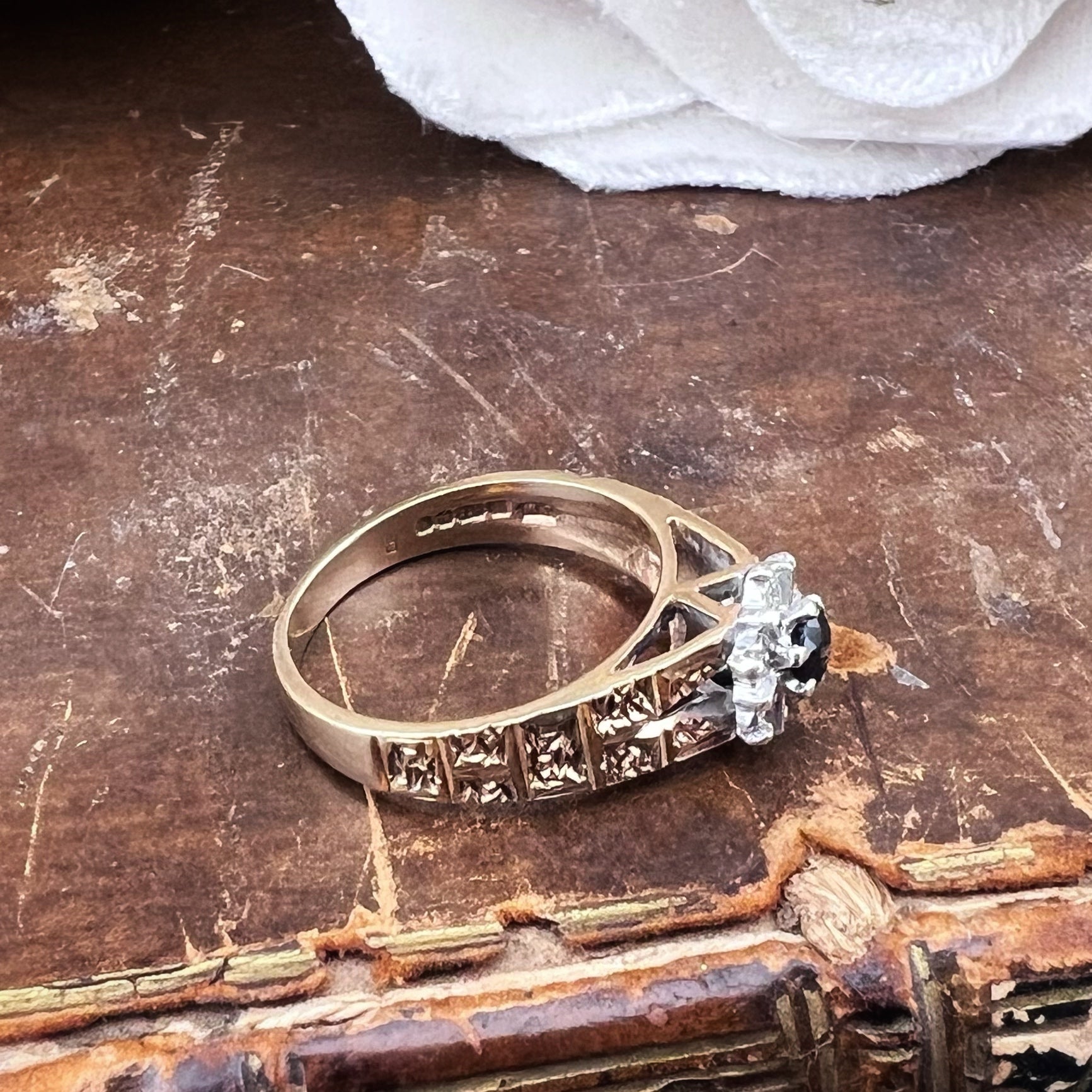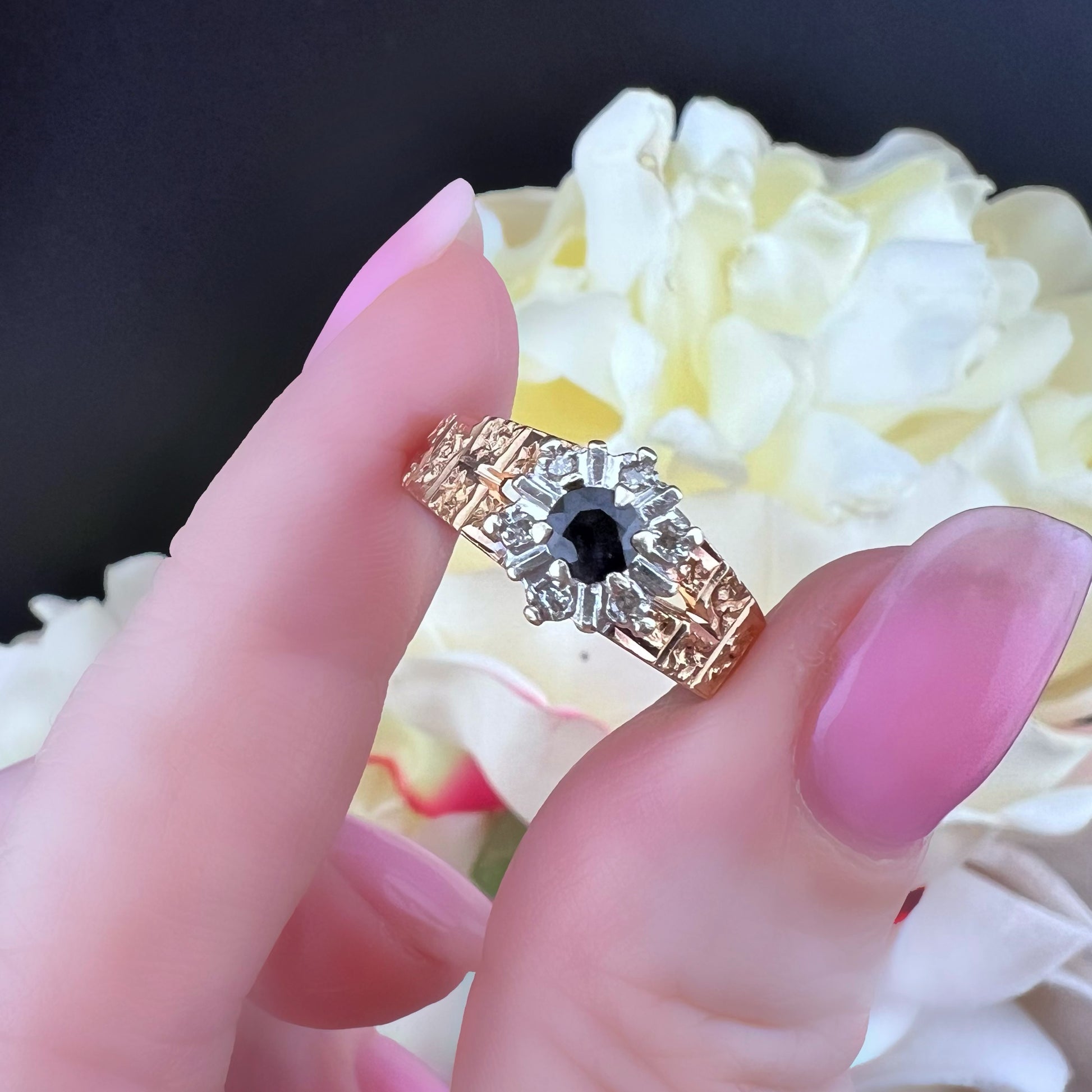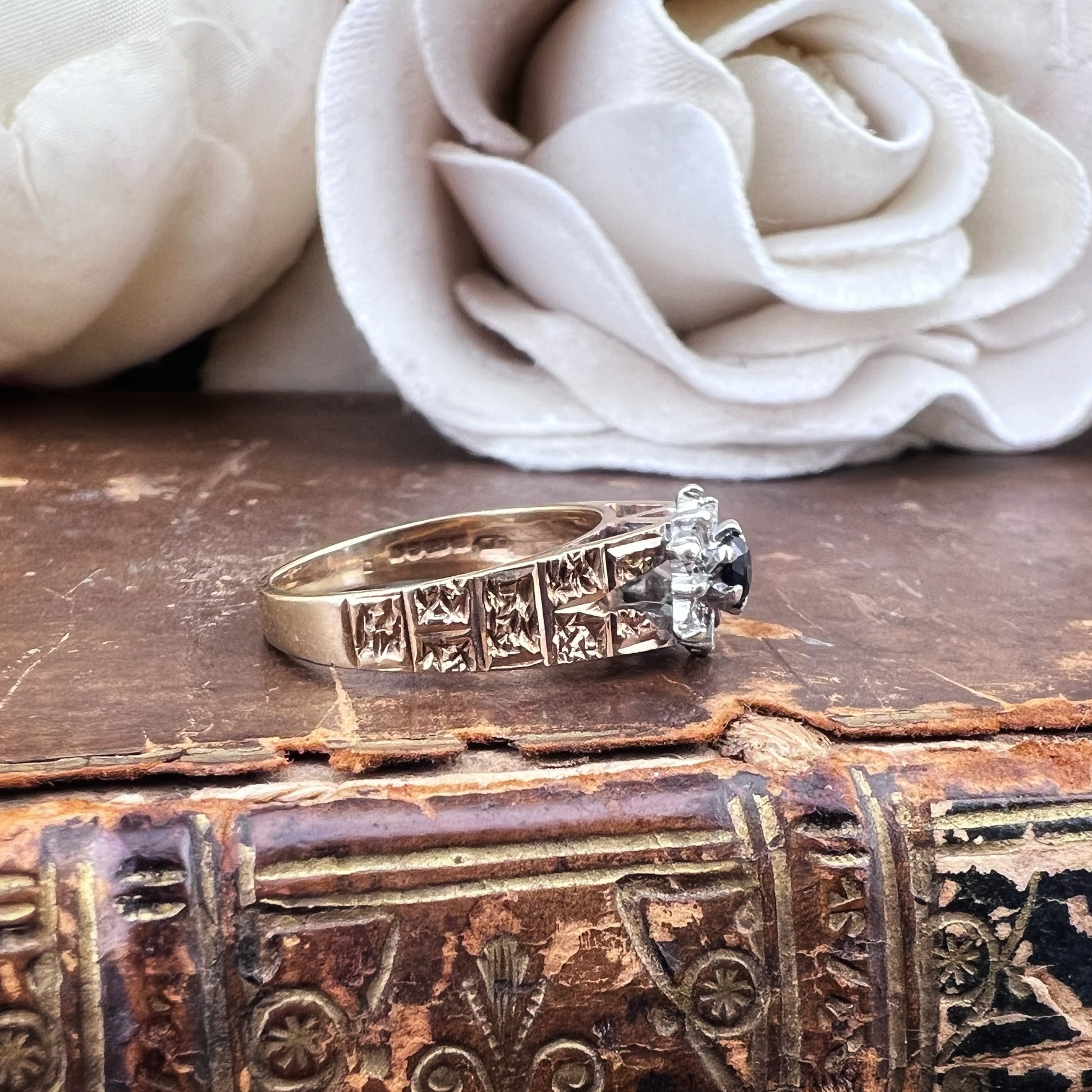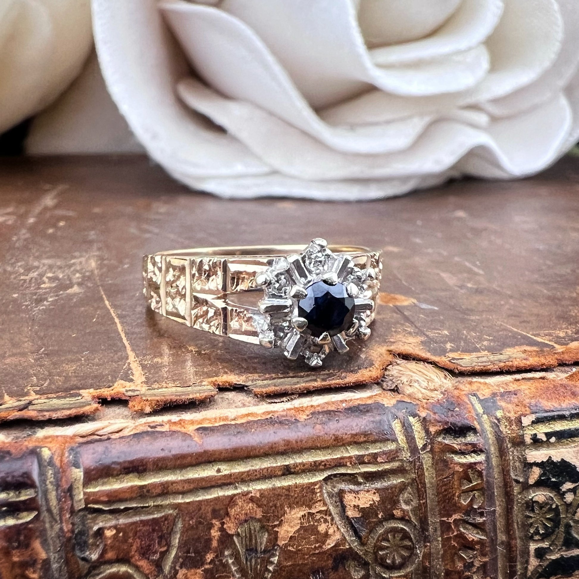 Margherita-Ring aus Gelb- und Weißgold mit Saphir und Diamanten – Birmingham, 1976