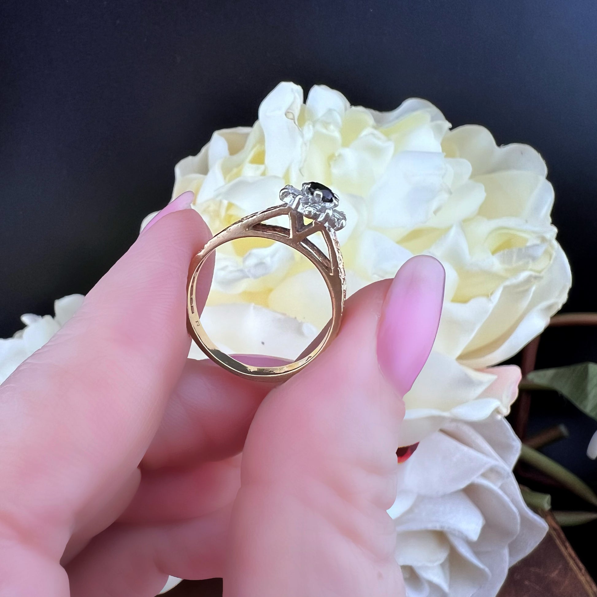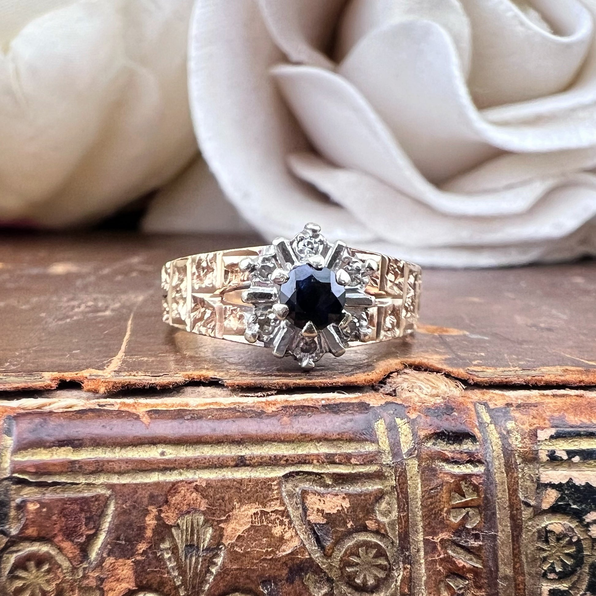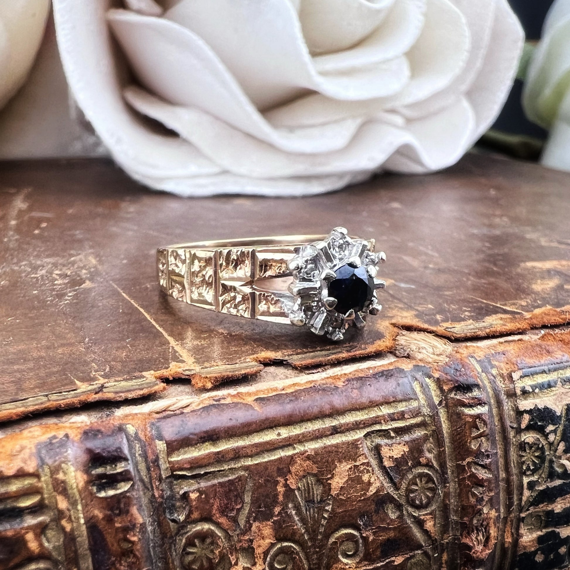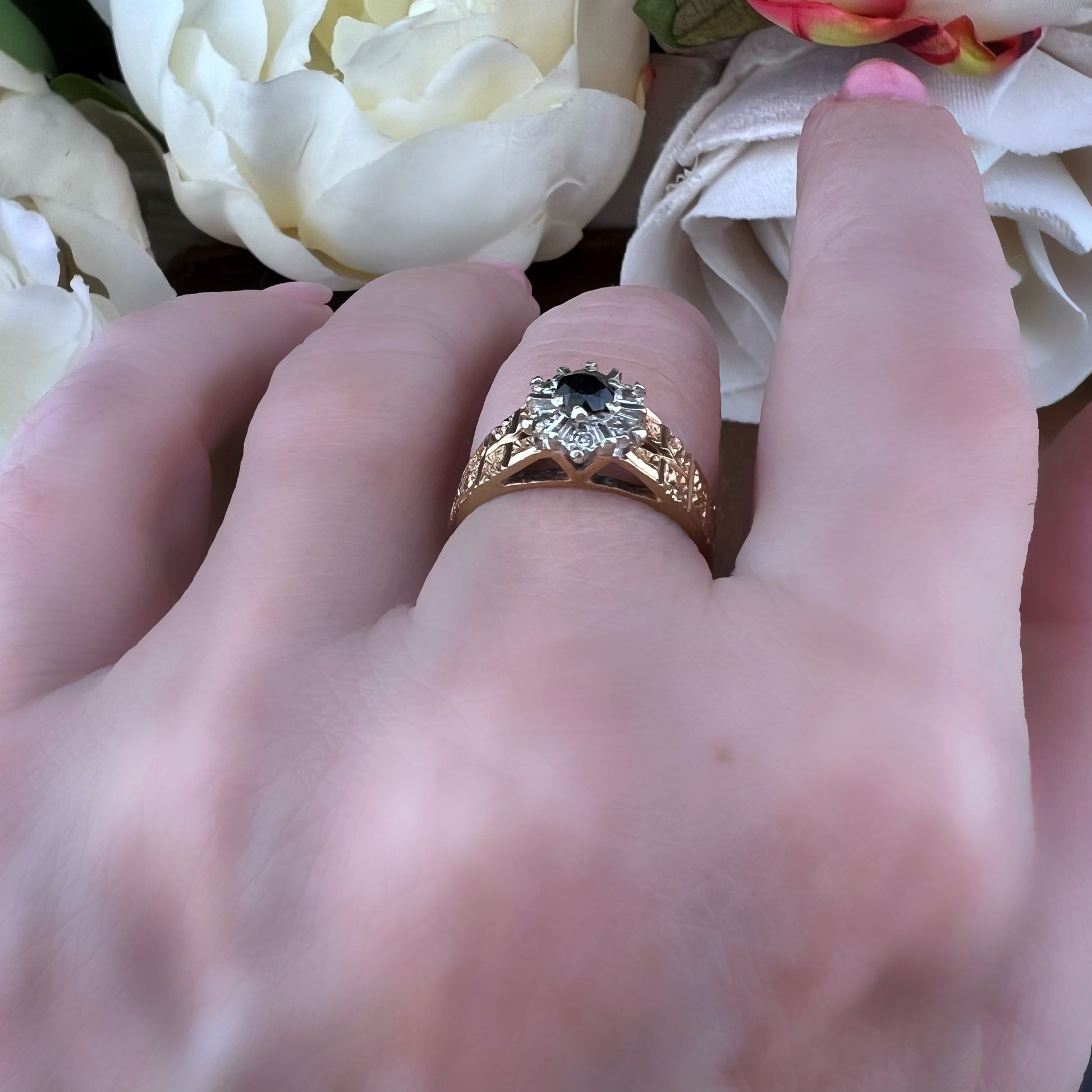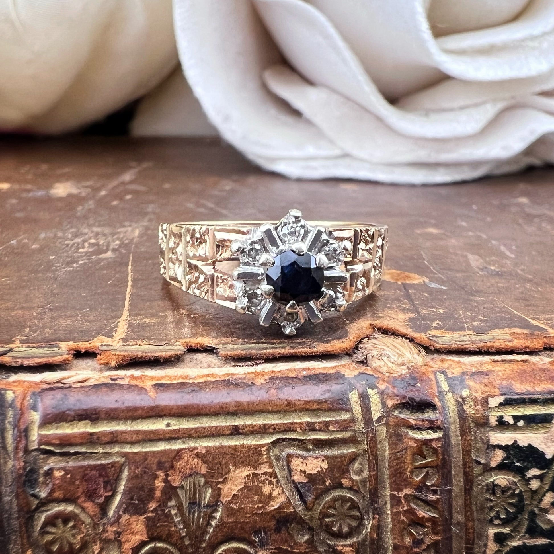 Margherita-Ring aus Gelb- und Weißgold mit Saphir und Diamanten – Birmingham, 1976