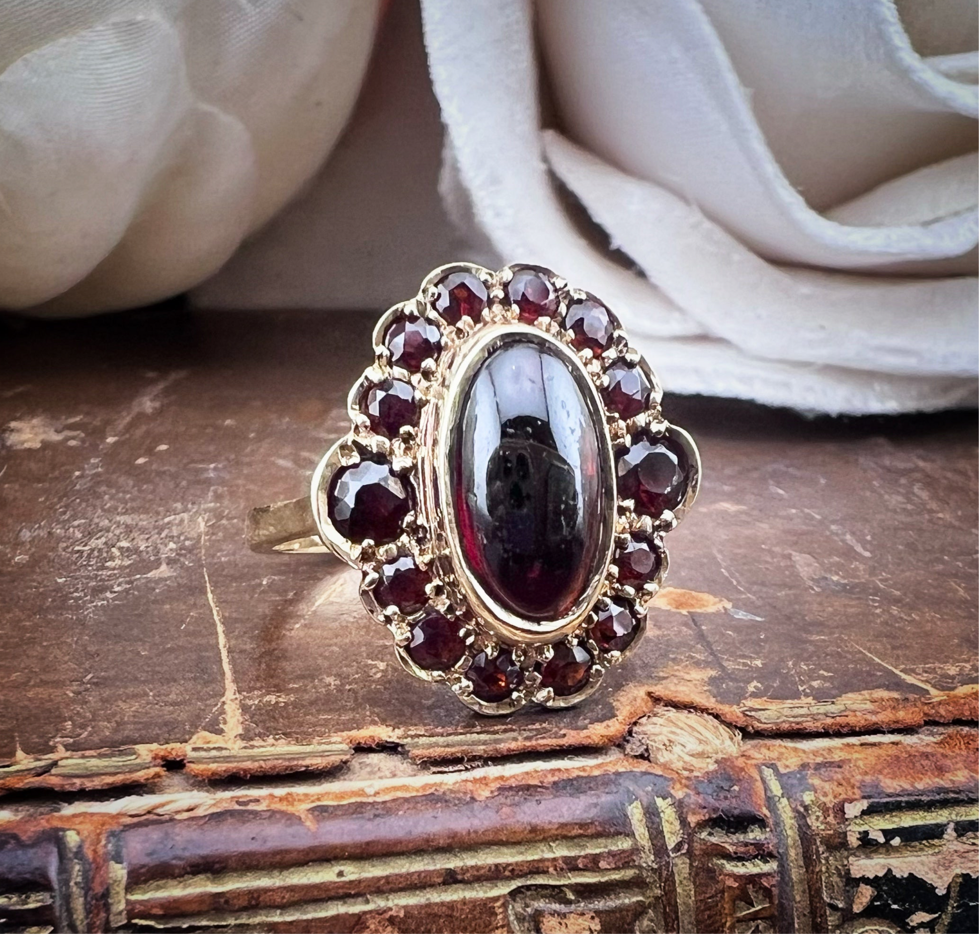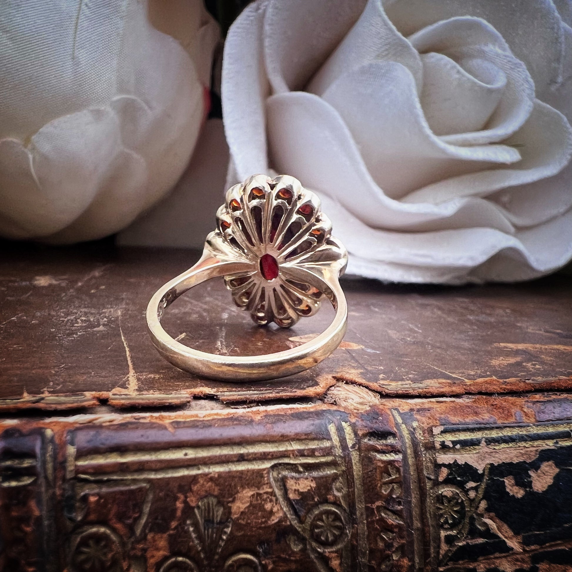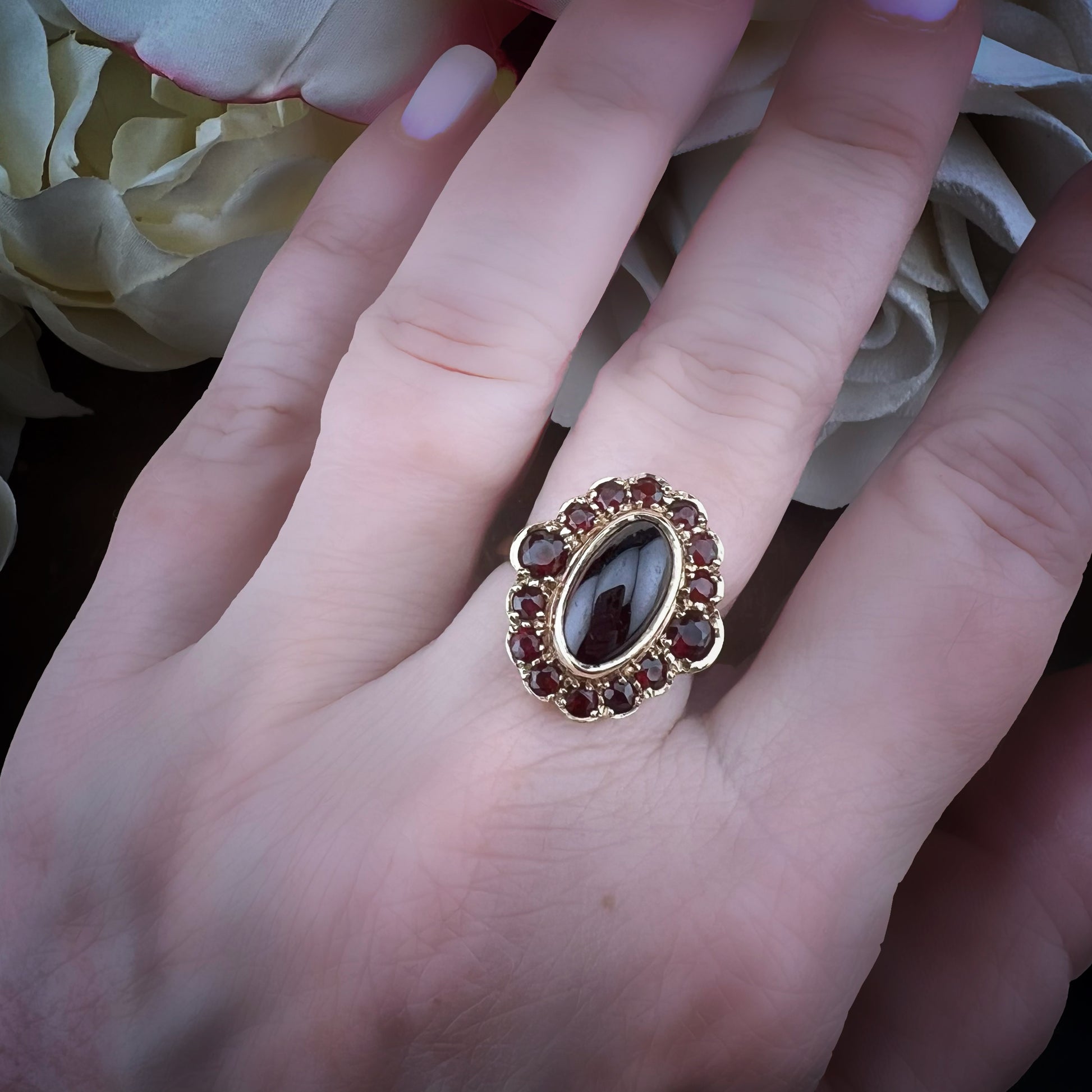 Der zentrale ovale, glatte Granat ist in eine Zargenfassung eingefasst und von zwölf runden Granaten mit 2,5 mm Durchmesser und zwei weiteren größeren Granaten mit 3,6 mm Durchmesser umgeben. Ein markanter und dramatischer Ring, ideal für alle, die ein elegantes, zeitloses Vintage-Stück suchen.