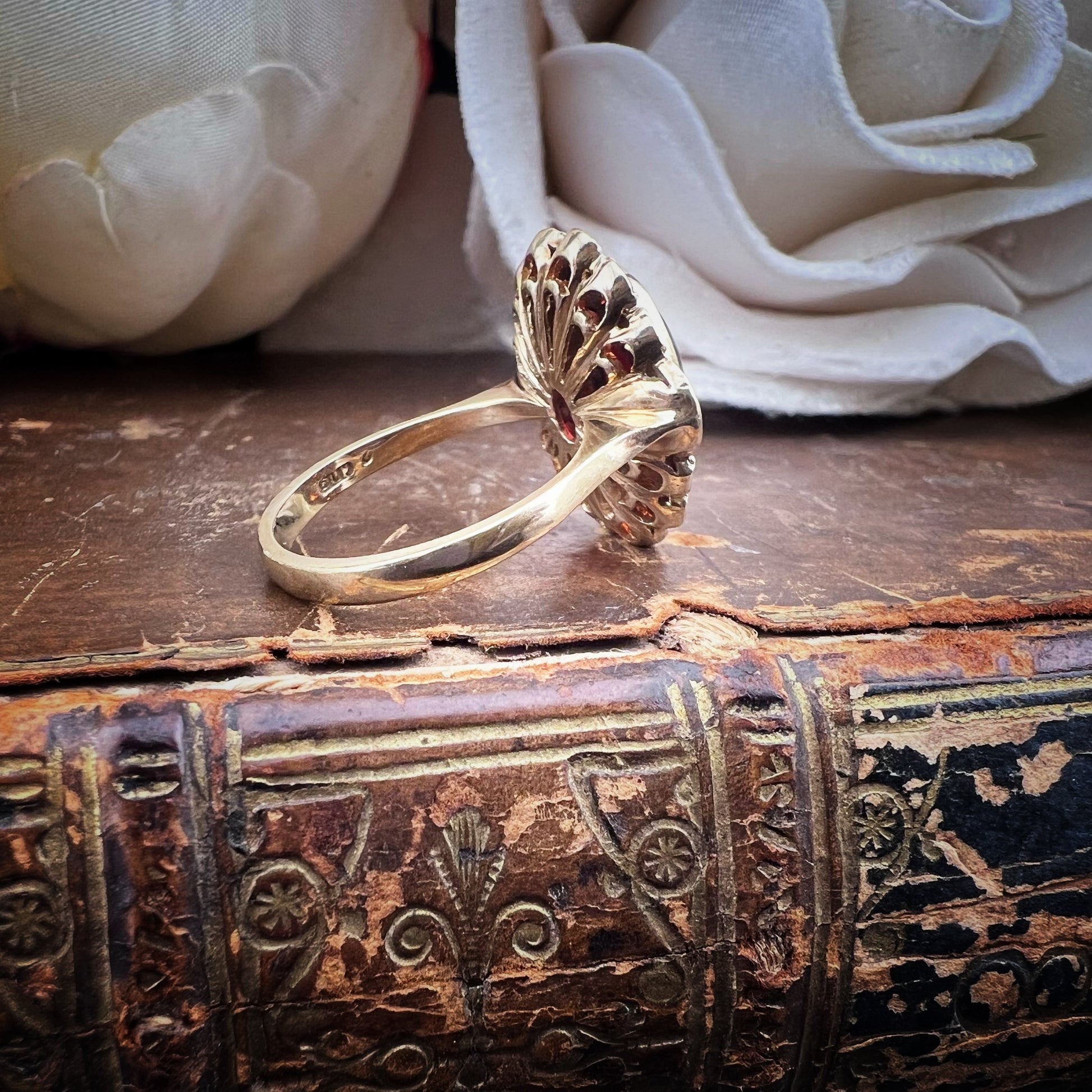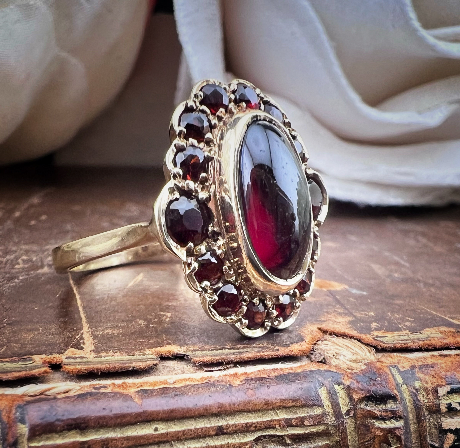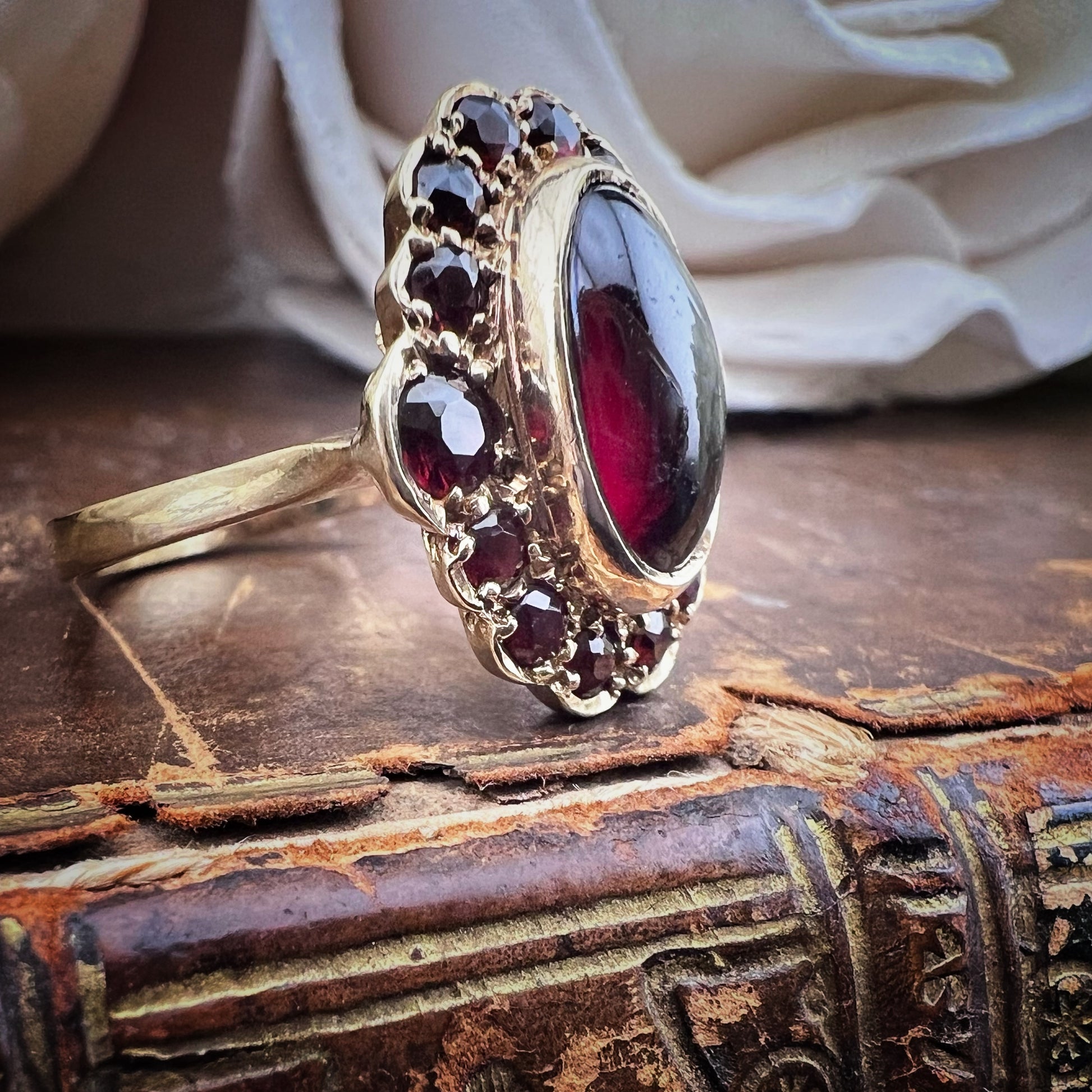 Der zentrale ovale, glatte Granat ist in eine Zargenfassung eingefasst und von zwölf runden Granaten mit 2,5 mm Durchmesser und zwei weiteren größeren Granaten mit 3,6 mm Durchmesser umgeben. Ein markanter und dramatischer Ring, ideal für alle, die ein elegantes, zeitloses Vintage-Stück suchen.