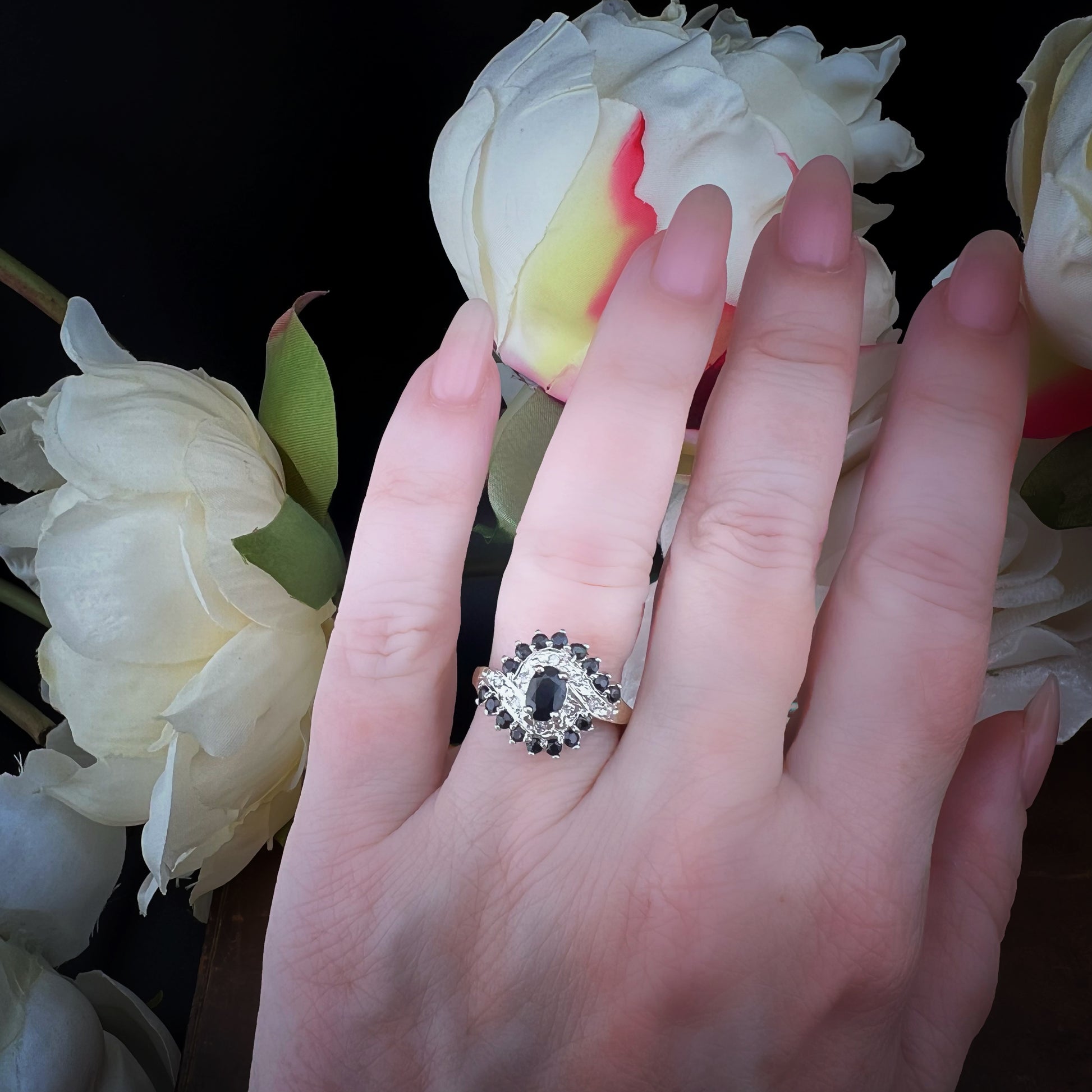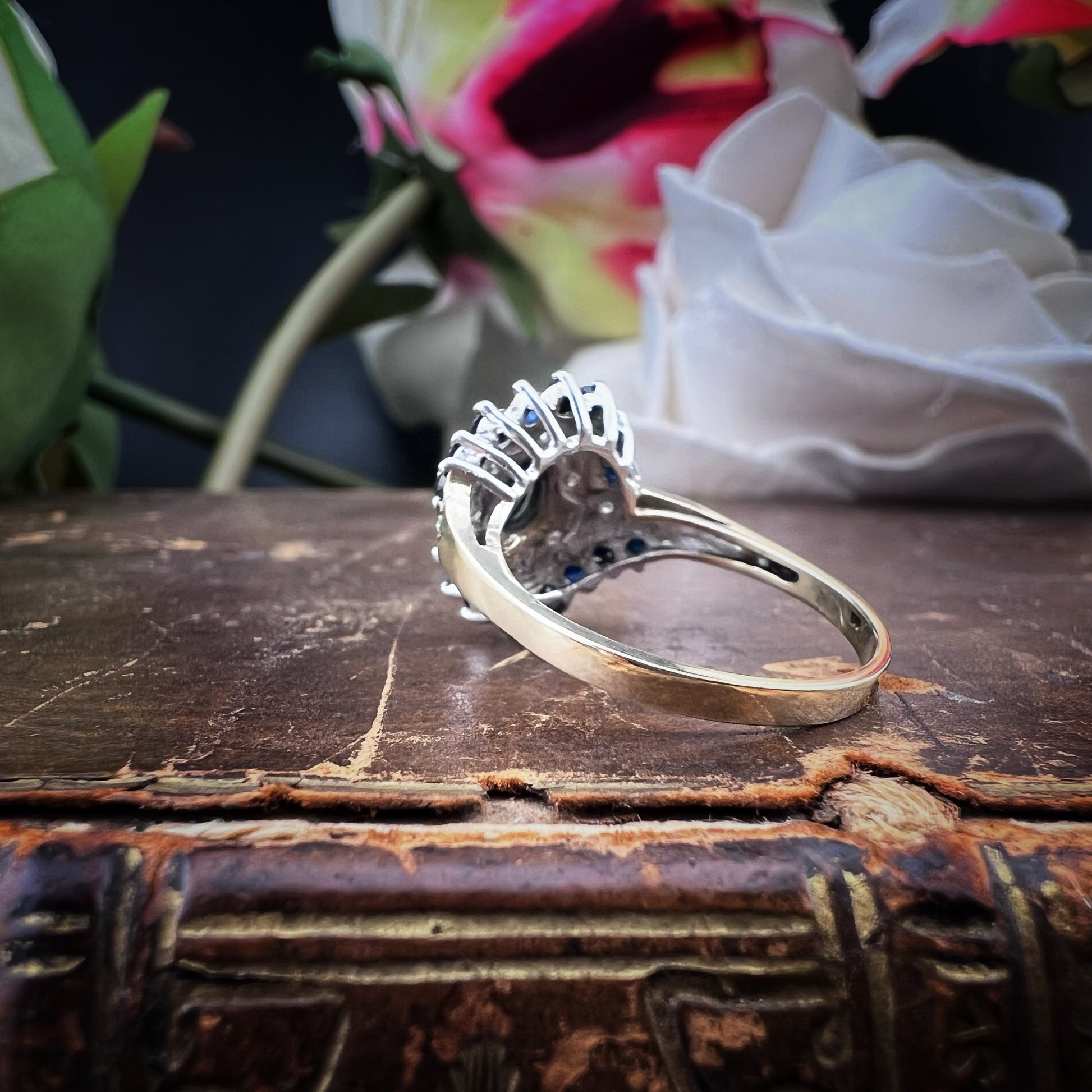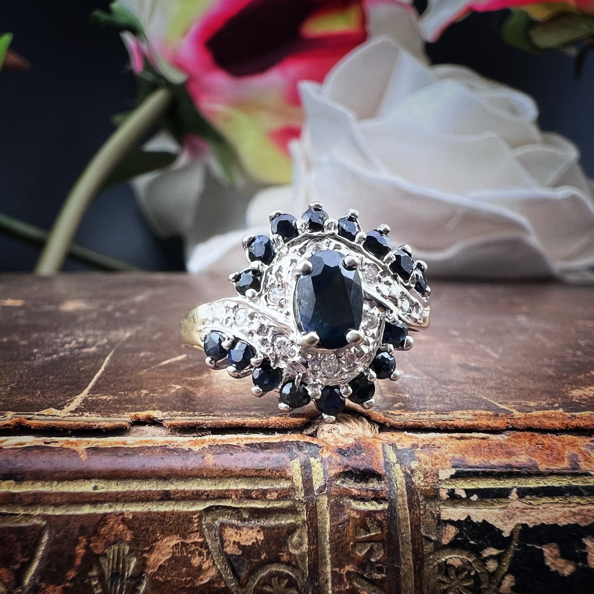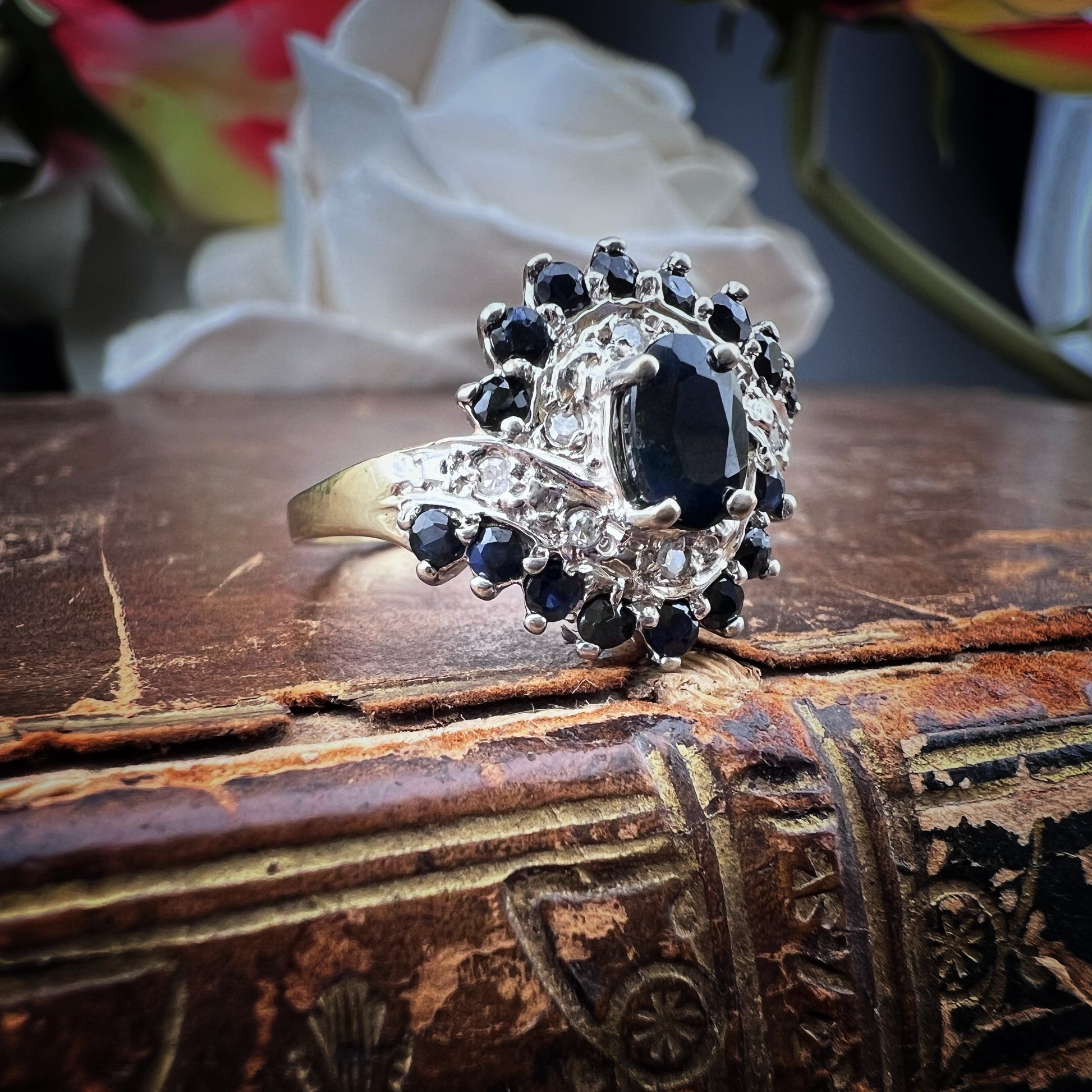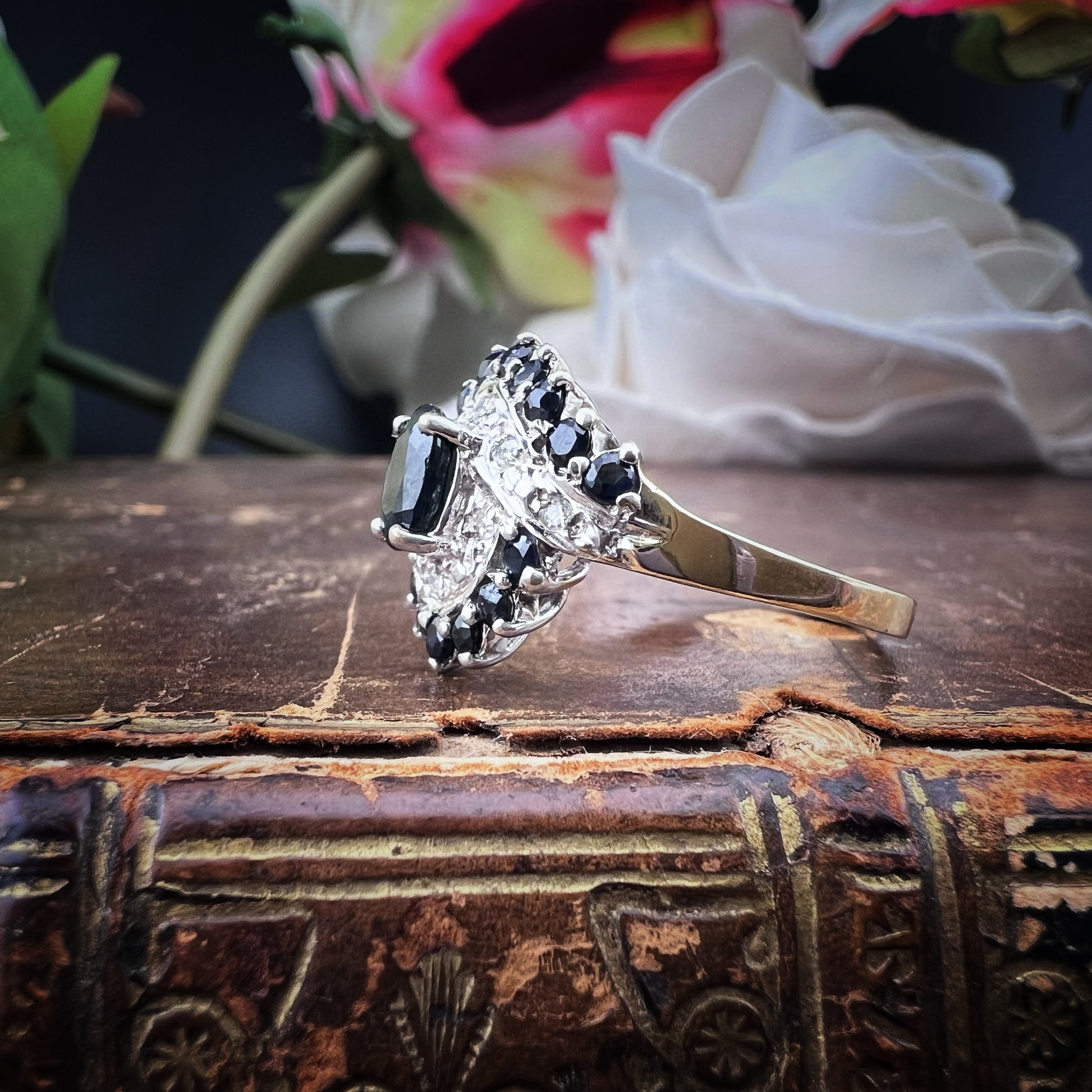 Das Licht der Diamanten reflektiert intensiv auf den tiefen, dunklen Oberflächen der Saphire und erzeugt einzigartiges Funkeln, das dem Ring einen lebendigen, edlen Glanz verleiht. Es ist ein Schmuckstück mit einem kräftigen und dennoch ausgewogenen Charakter, perfekt für alle, die einen Vintage-Touch mit unvergleichlicher Eleganz suchen.