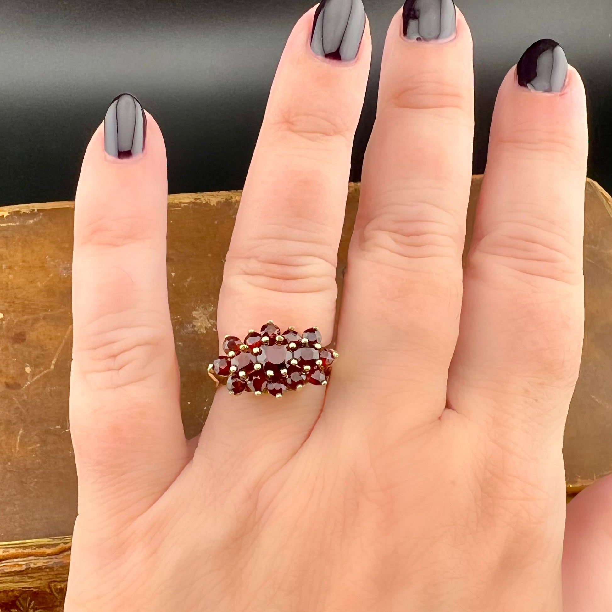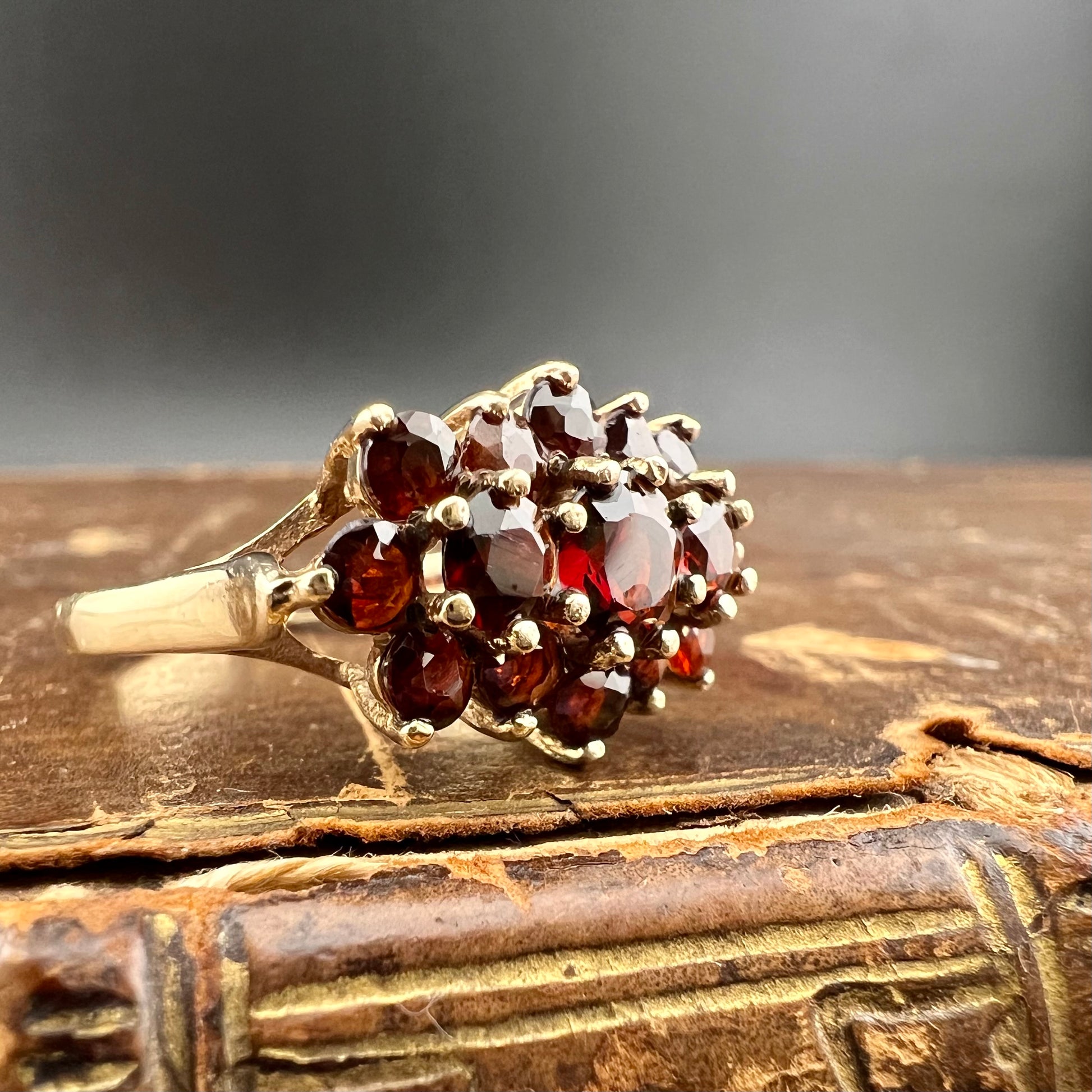Dieser seltene und exquisite schottische Ring aus Edinburgh stammt aus dem Jahr 1979 und ist ein wahres Juwel seiner Zeit. In einer kunstvollen Korbfassung umschließt dieser Ring fünfzehn Granate von außergewöhnlicher Schönheit. Im Zentrum der Komposition befindet sich ein größerer Granat in einer höheren Fassung, flankiert von zwei Reihen kleinerer Granate, die das Design dreier ineinander verschlungener Gänseblümchen vervollständigen.