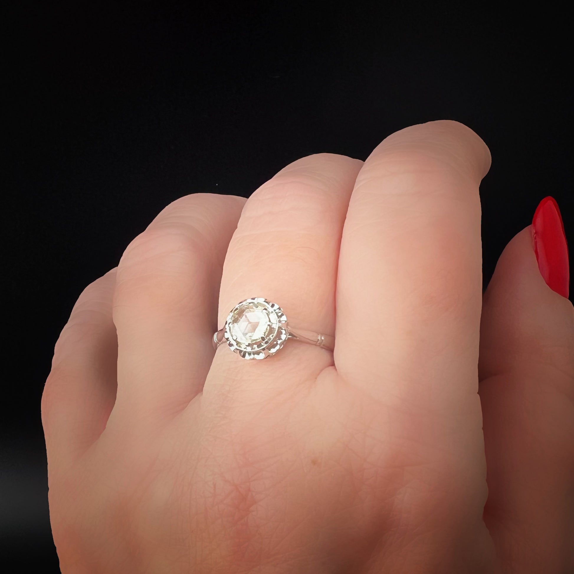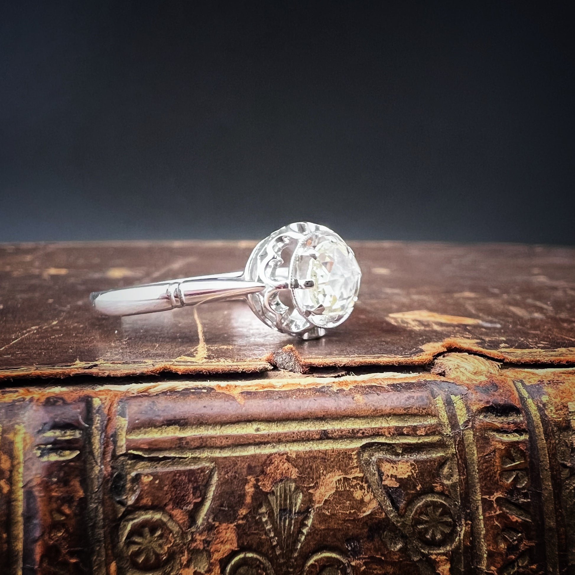 Dieser Solitärring stammt aus den 1930er Jahren und verkörpert perfekt den Stil und die Handwerkskunst dieser Ära. Das Design aus feinem 18-karätigem Weißgold besticht durch seine knospenförmige Korbfassung: eine hohe, gewölbte und fein durchbrochene Fassung, die die Brillanz und Schönheit des Diamanten unterstreicht.