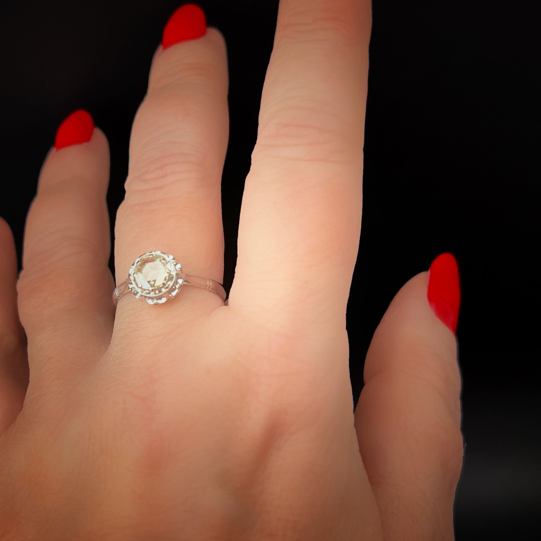 Im Herzen dieser kostbaren Kreation erstrahlt ein 5,6 mm großer Diamant im Rosenschliff – rein, klar und außergewöhnlich brillant. Seine kristalline Brillanz wird durch die Leichtigkeit der Fassung verstärkt und verleiht dem Schmuckstück eine ätherische und zarte Aura. Dieser Ring ist ein Symbol zeitloser Eleganz, perfekt für alle, die ein einzigartiges und faszinierendes Schmuckstück mit dem Charme vergangener Zeiten suchen.